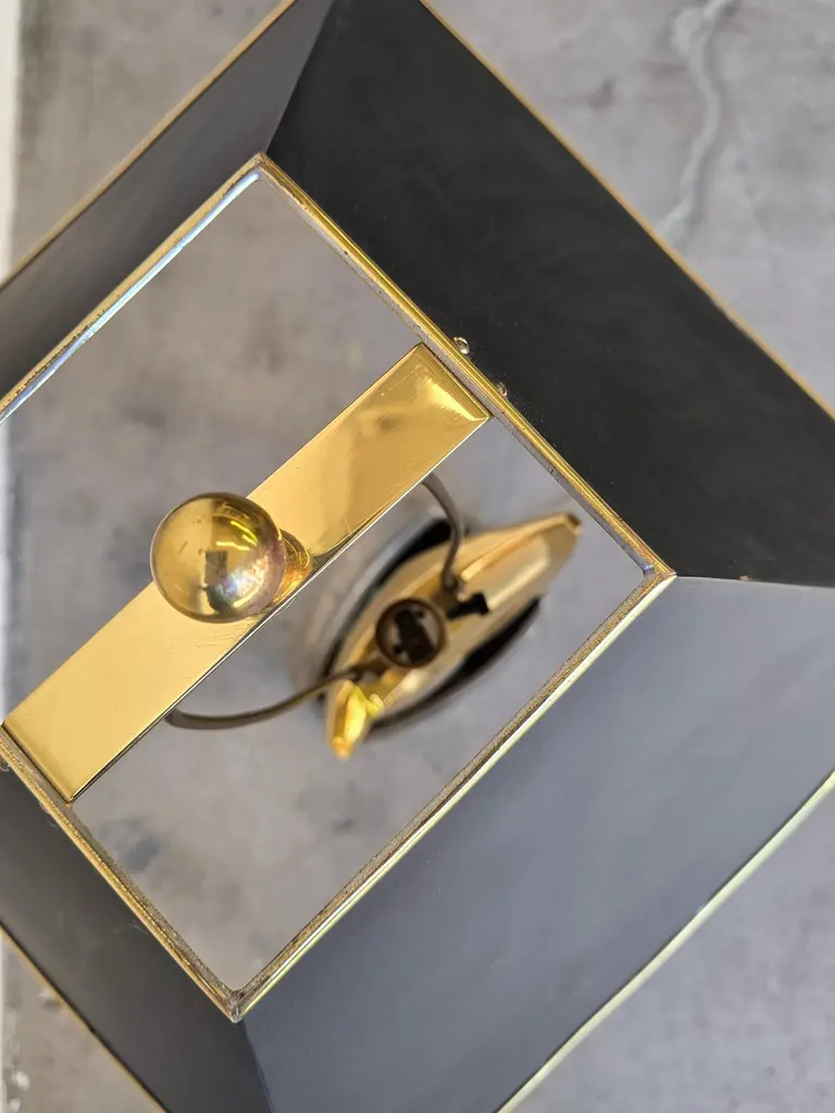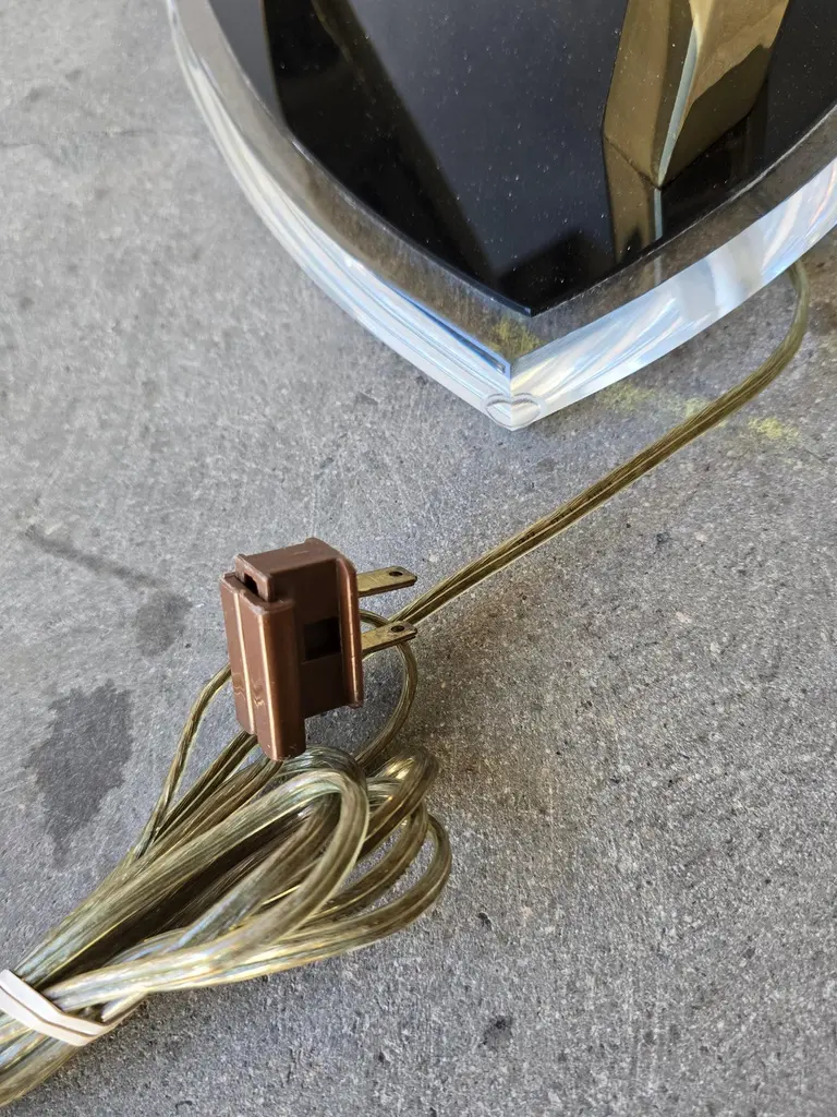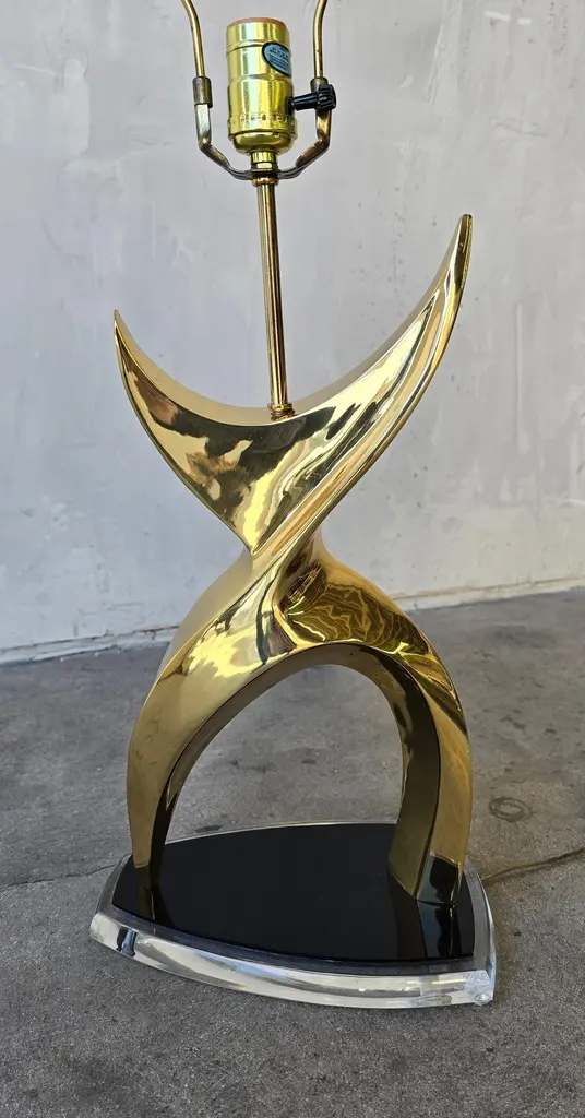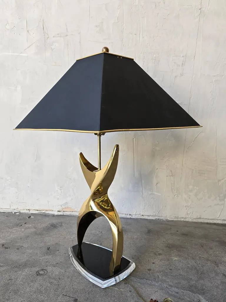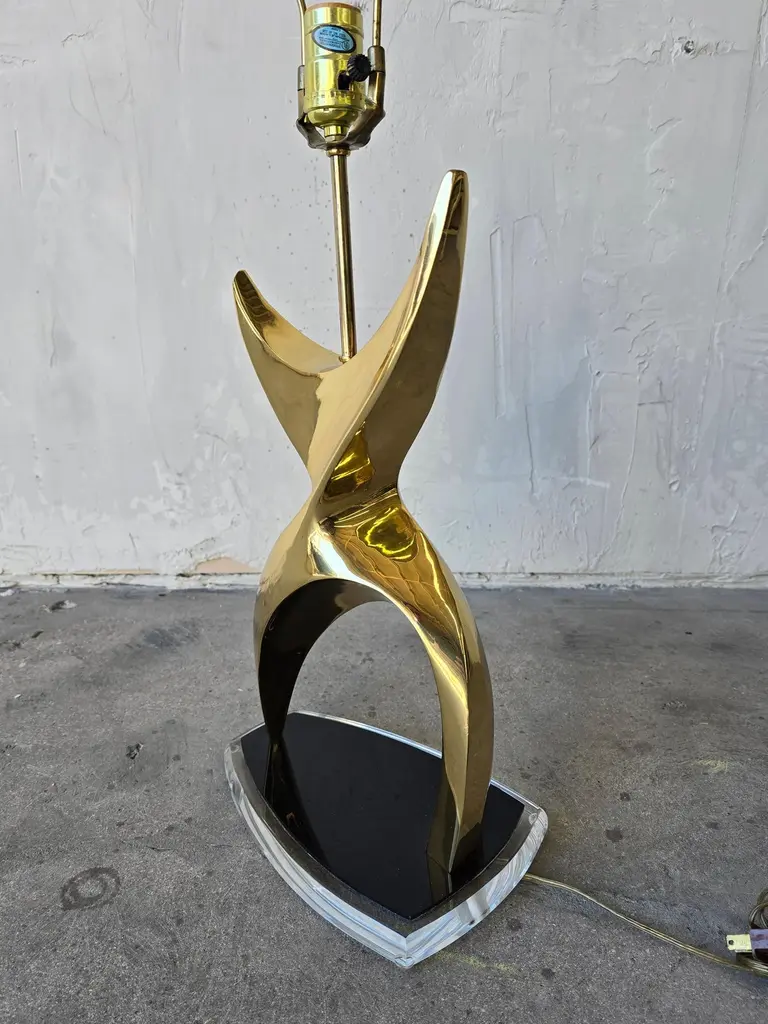 Absolutely stunning figural brass lamp with black acrylic and lucite base. Shade is solid brass and as heavy as the lamp.Lamp is in excellent working condition with only minimal signs of age or use.