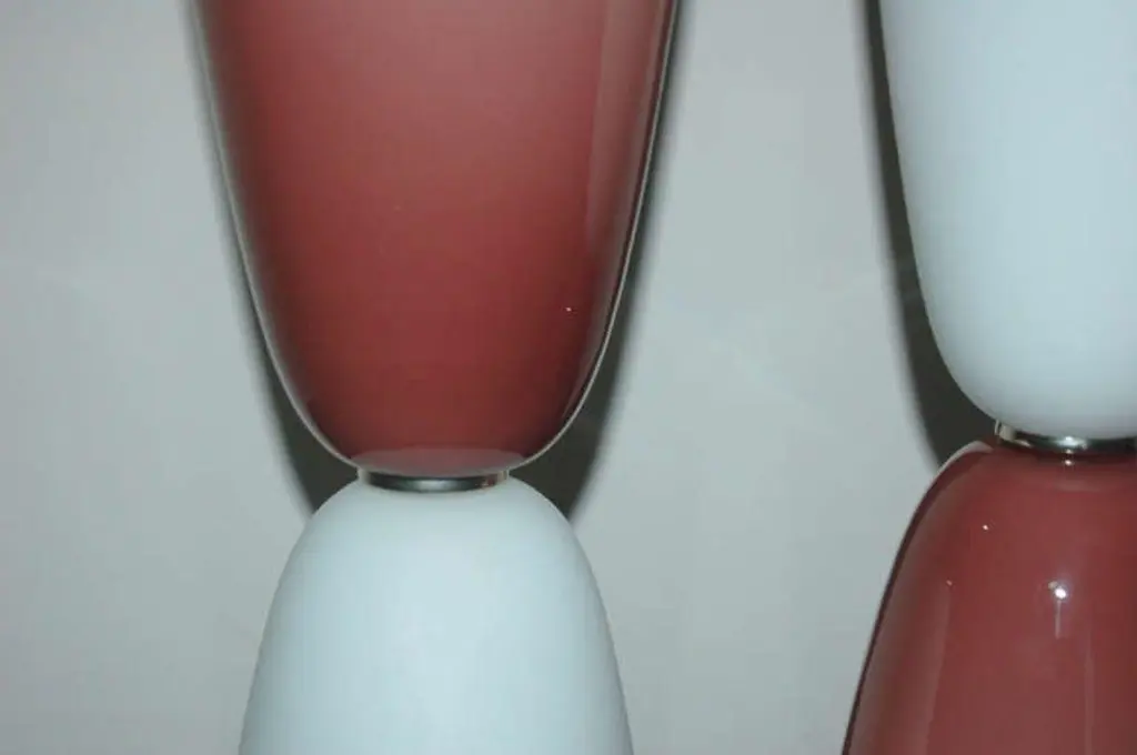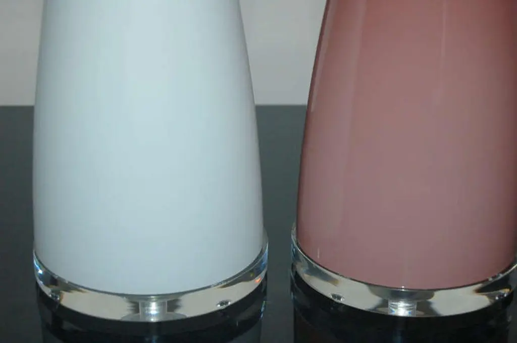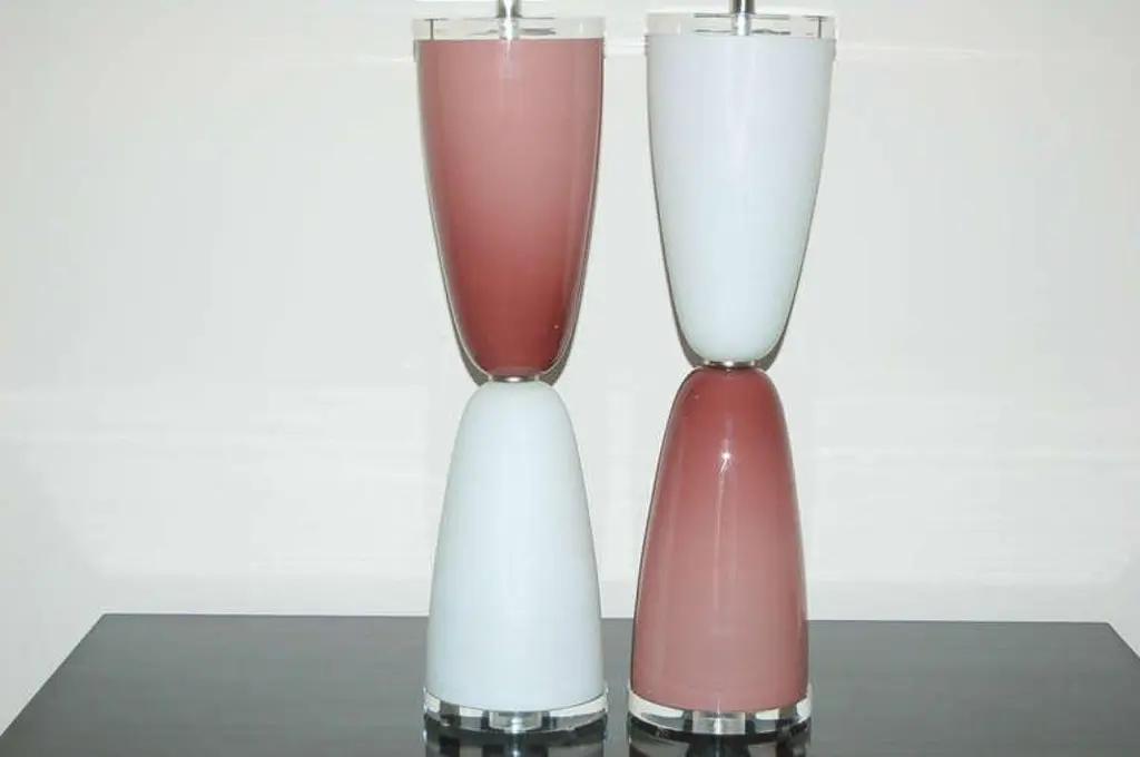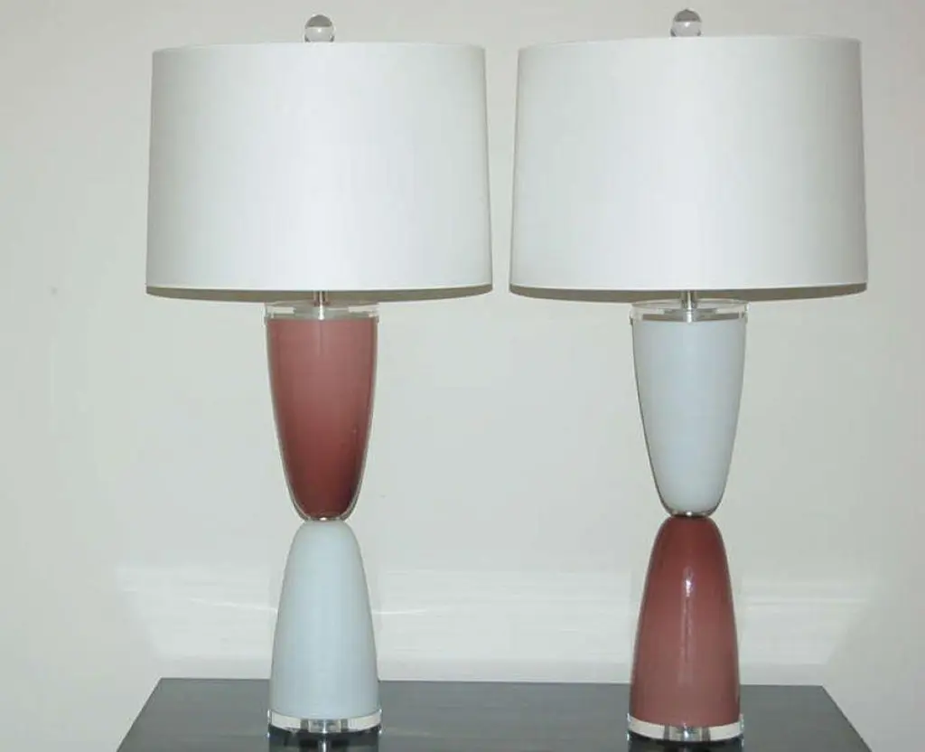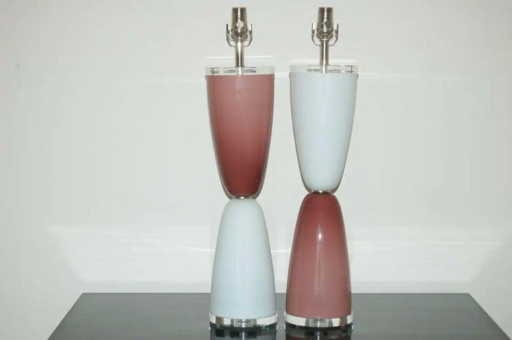 Harken back to the 1960’s with this extra cool pair of parabolic lamps in PLUM AND WHITE. Vintage Murano lamps sandwiched between discs of Lucite – simple and fun!They stand 27 inches from tabletop to socket top. As shown, the top of shade is 32 inches high. Lampshades are for display only and not available for sale.