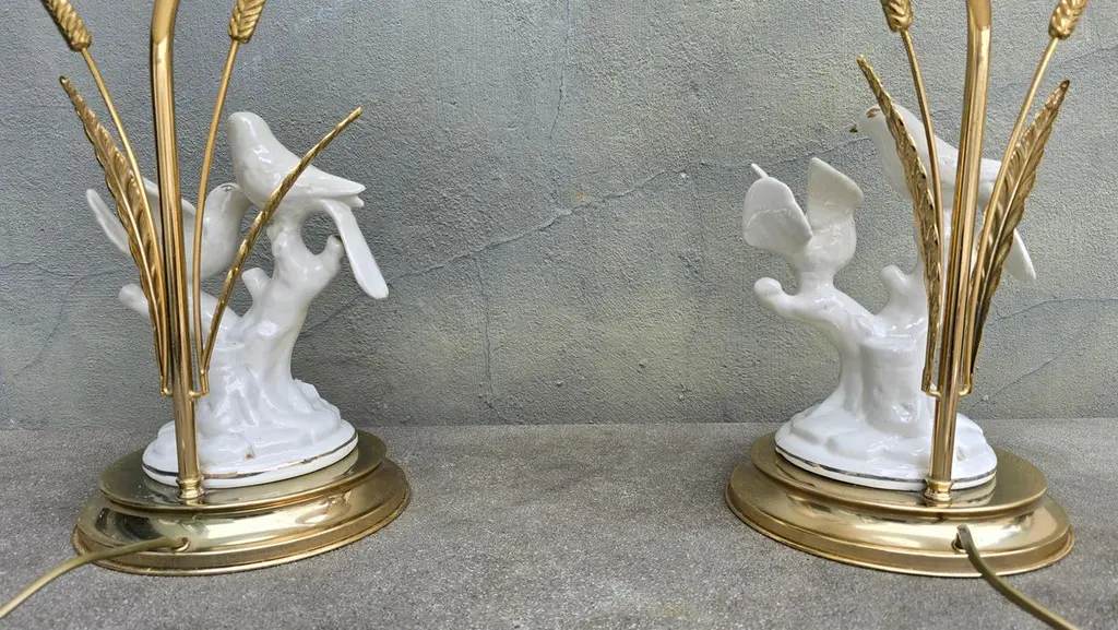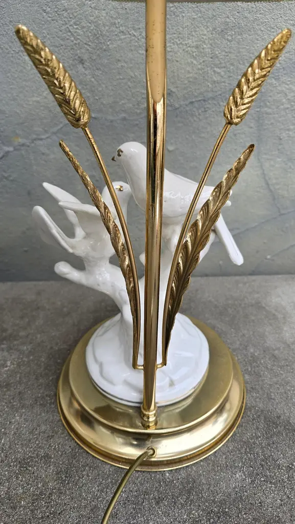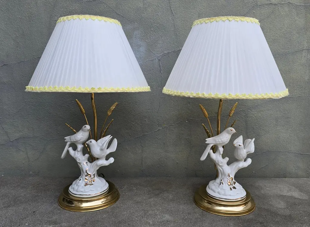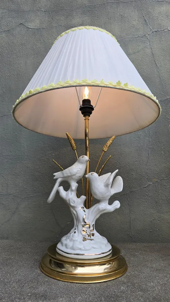 Vintage Porcelain Table Lamp with Birds and Brass Accents, 1970sCharming vintage table lamp from the 1970s featuring a decorative white porcelain base with two finely detailed birds perched on a stylized tree branch. Behind the birds, elegant brass wheat stalks add a refined natural touch to the design.The original pleated fabric lampshade with yellow trim is included. It remains in good condition with some light discoloration consistent with age, adding to its authentic vintage character.Fully functional and fitted with a single E14 bulb socket (European small base). Ideal as a statement lighting piece in a classic, romantic, or eclectic interior.Specifications:Date: circa 1970Materials: Porcelain, brass, fabricHeight: 64 cm (25.2 in)Shade diameter: 44 cm (17.3 in)Bulb socket: 1x E14Availability: Sold individually or as a pairPrice is per lamp. A special price can be offered if both lamps are purchased together.
