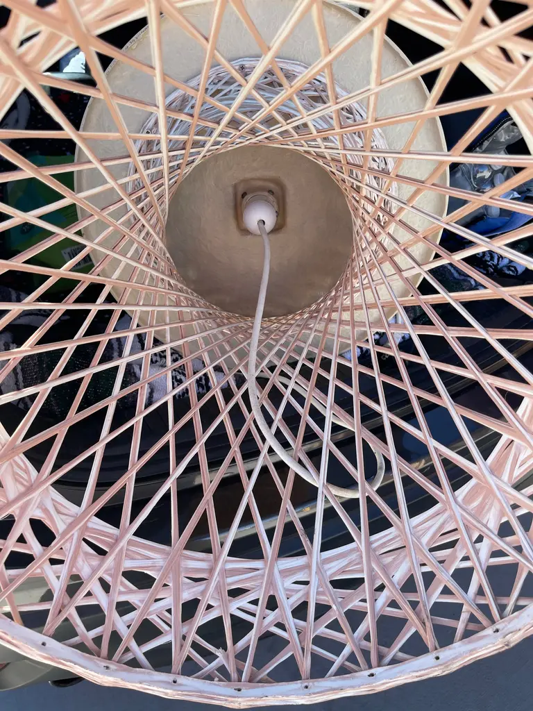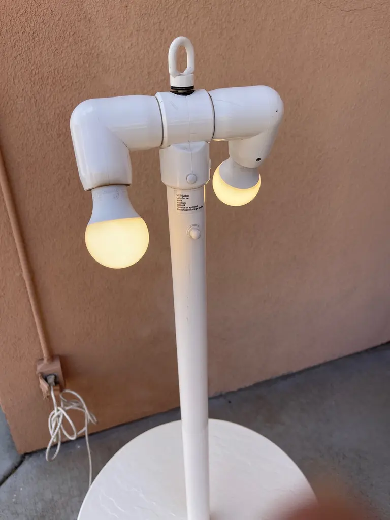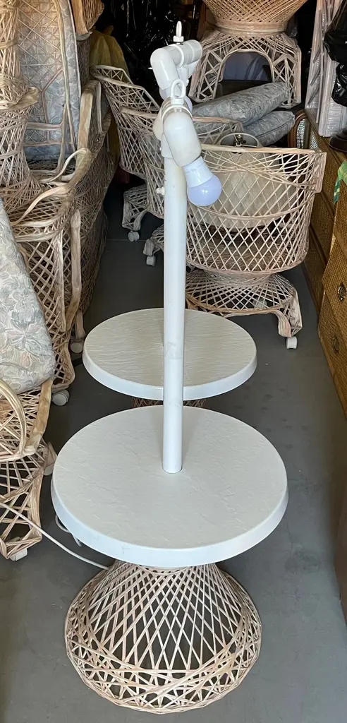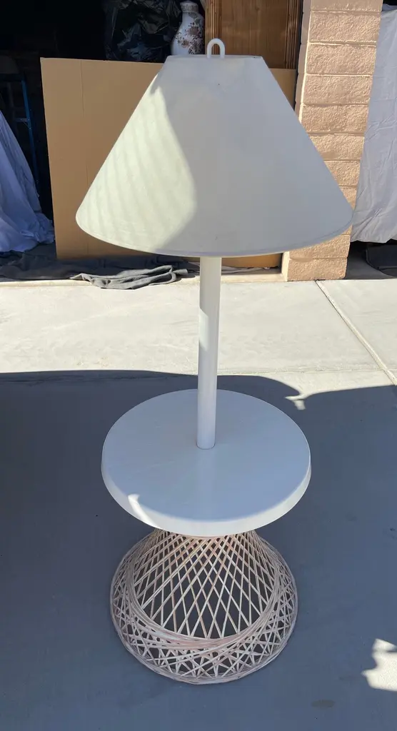 Vintage Russell Woodard Style Spun Fiberglass Side Table Lamp. I've never seen a table lamp but once, they are super hard to find. Beige spun fiberglass with a textured white table and light pole. Would be great with other pieces from this collection. These also would be great painted black (which I might do as well), can't find marking but in the style of russell woodard. I have other pieces including a chaise lounge, 2 sofa's, bar cart, lamps, table w /chairs and a coffee table that will also be available in my shop. Both lamps shown in pics working 54in h table is 21in h x 21in base and 19in top table 1.5in thick table top-plastic with a texture top Lamp shade not included water resistant