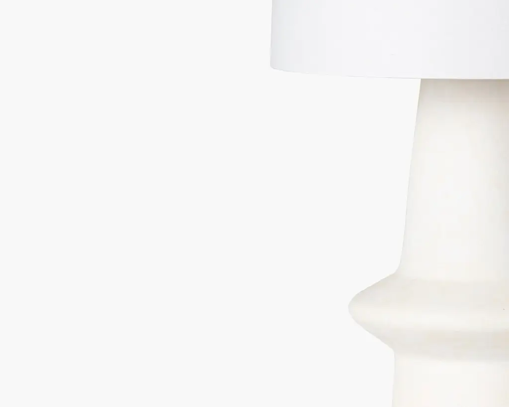 Clean lines, a sleek silhouette and an all-white color scheme make this modern table lamp extremely useable on surfaces throughout the home. The ceramic pale flax base adds a warm, earthy element and a subtle texture. Overall dimensions: 31.5"h. x 15"diam., E26 Medium Base Weight: 15 lbs Uses 1 Bulb Cord Length: 96" Plug In Assembly Required Receives UPS delivery