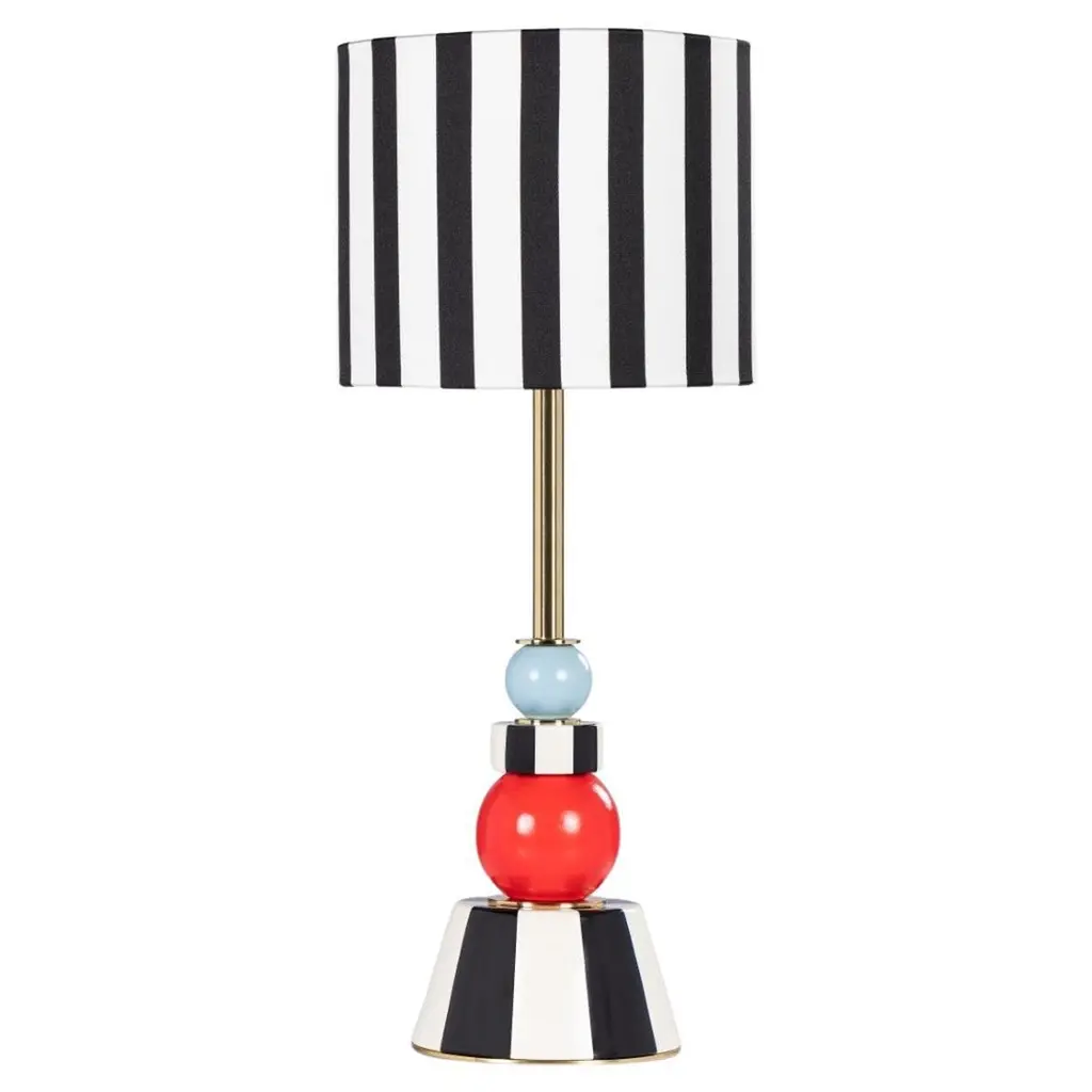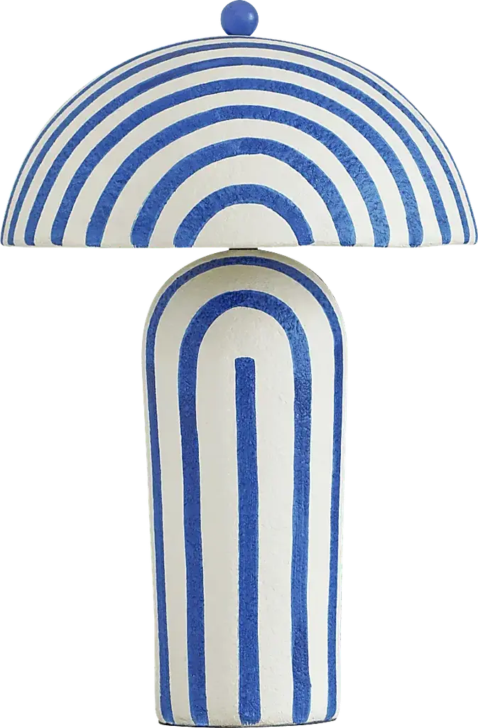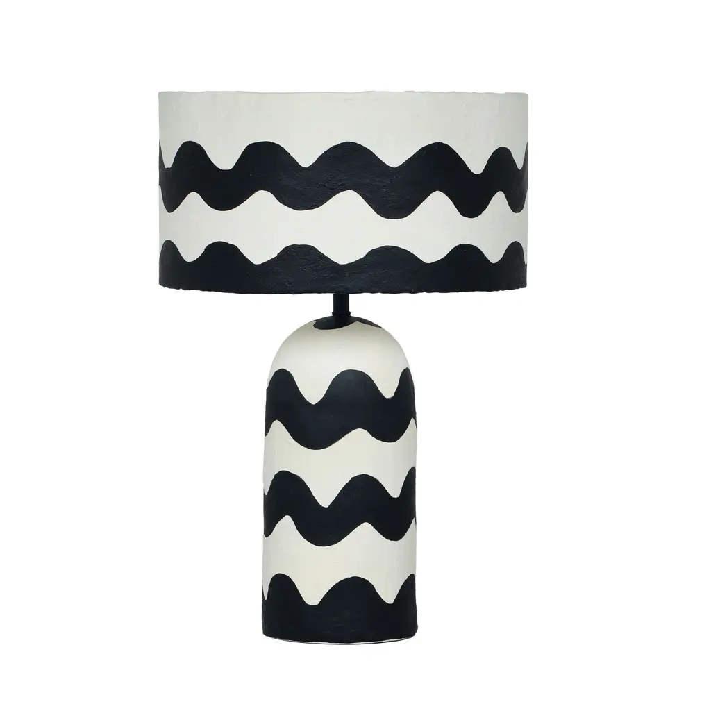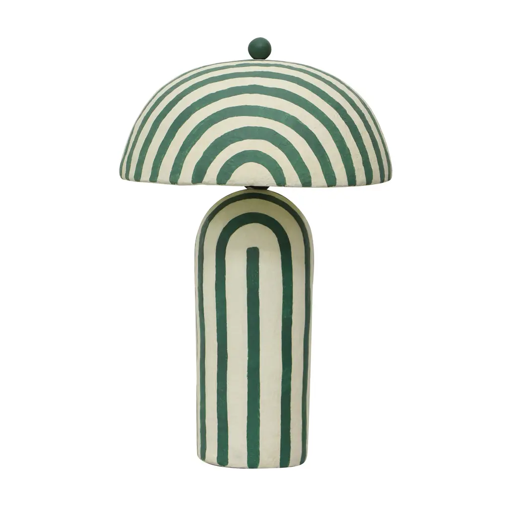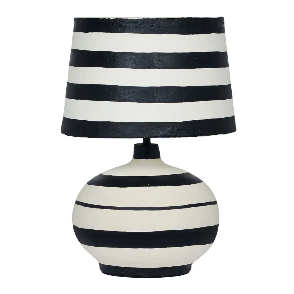 Illuminate your space with the charming Striped Papier Mache Table Lamp, featuring a beautiful bold silhouette crafted from innovative paper mache construction. The lamp's punchy stripes add a playful touch, complemented by a domed lampshade and an adorable orb finial. This lamp effortlessly adds striking personality to any space, making it a delightful and stylish accent for your home.