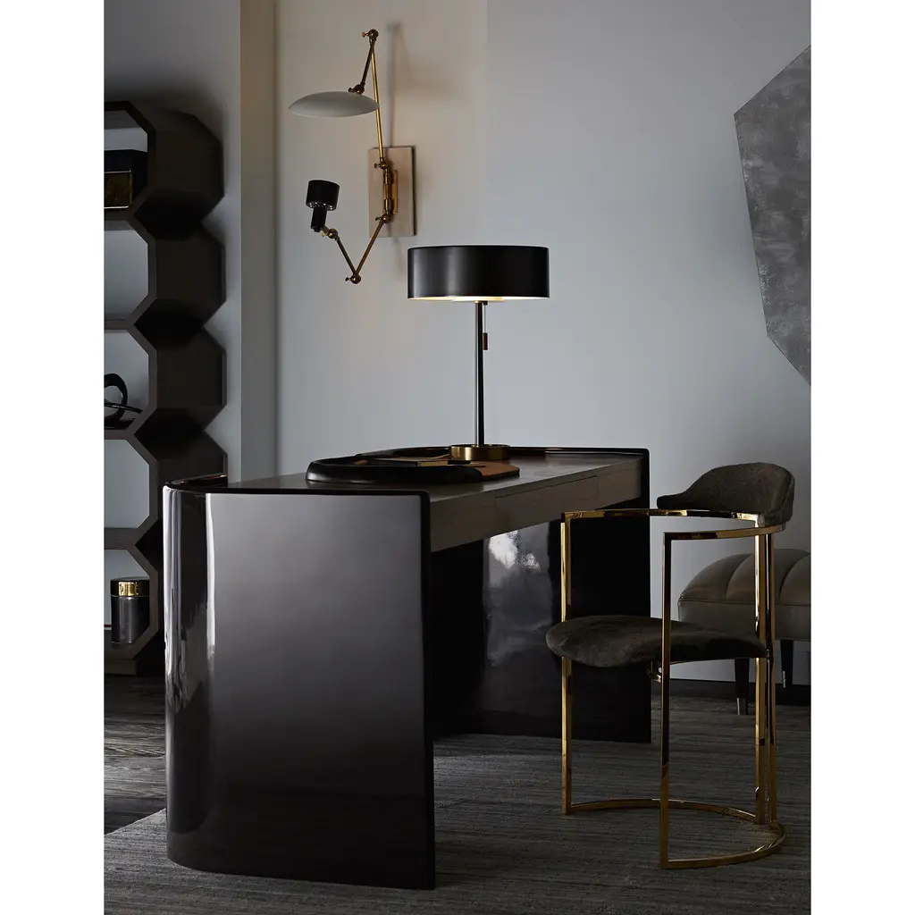 This deceptively simple design has many noteworthy details from the clever open base to the metal drum shade with a frosted acrylic diffuser to the double socket with one pull chain. This is a modern classic