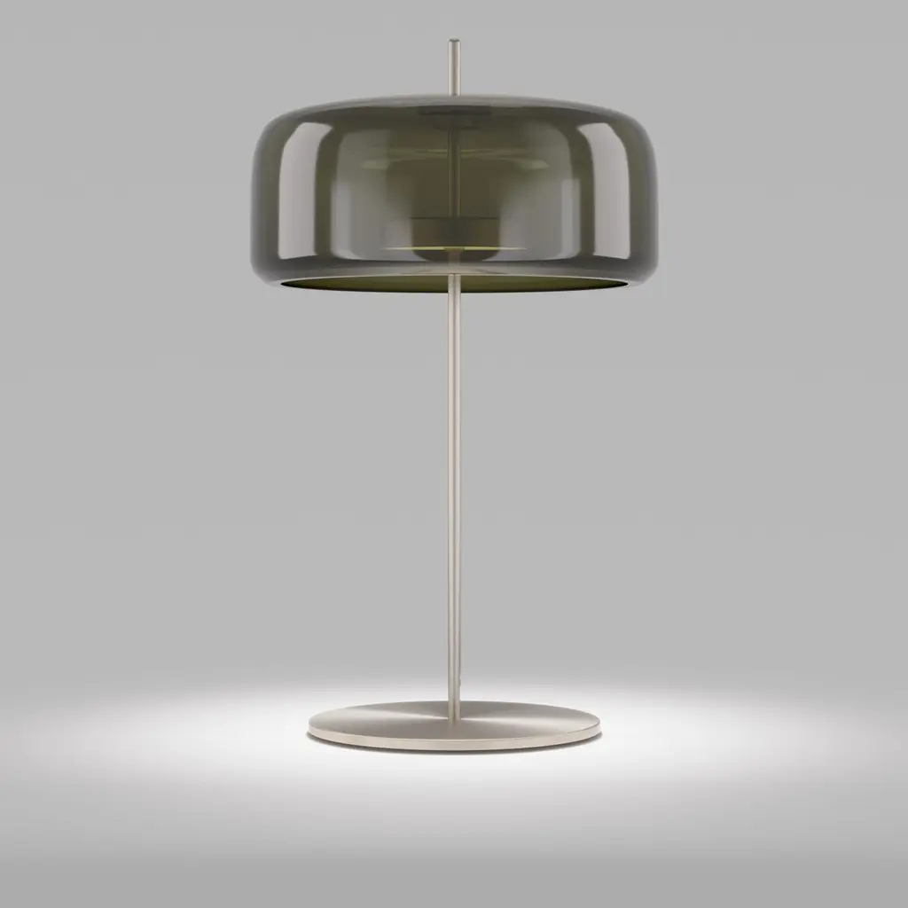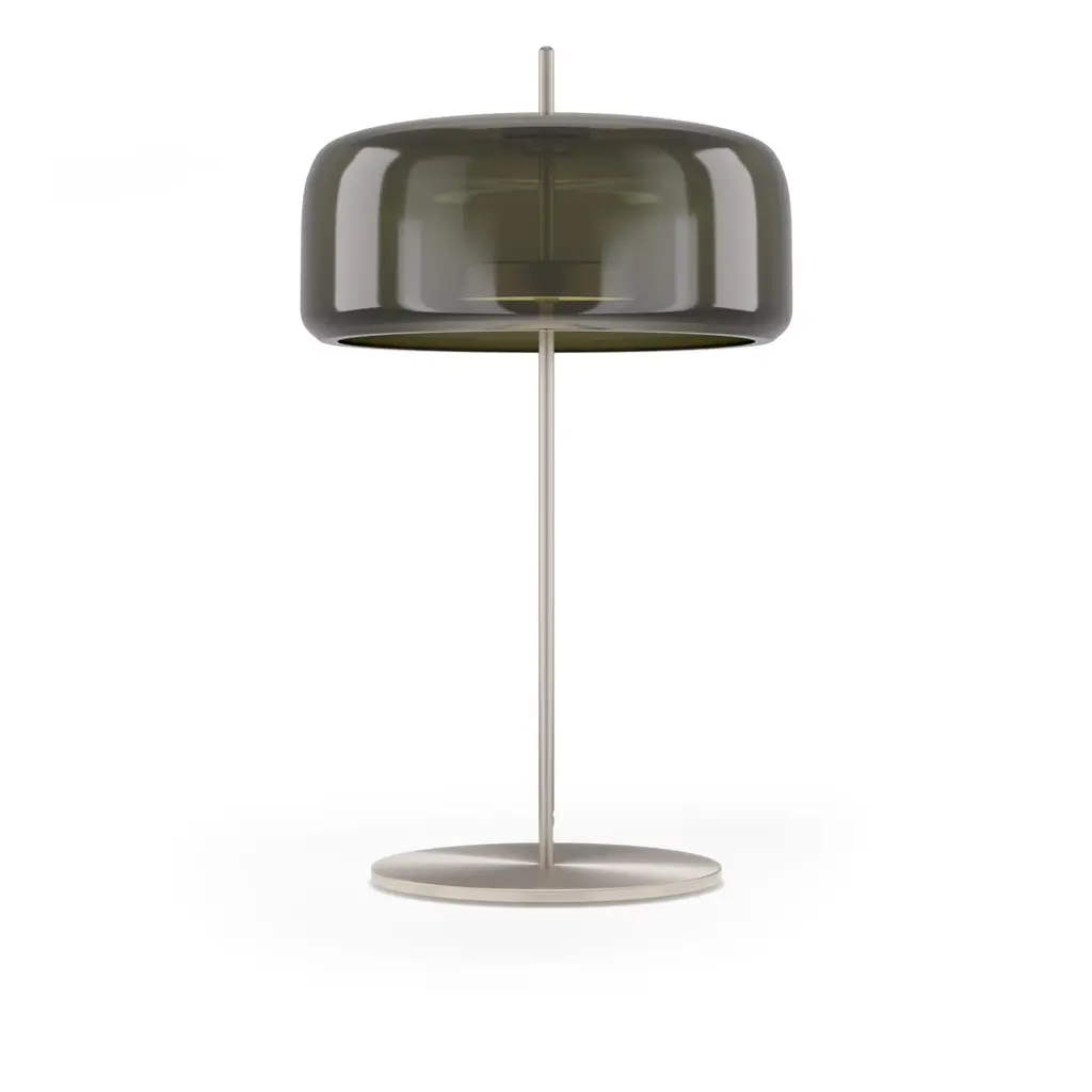 The elegant and delicate look of the blown glass finds a new dimension in Jube. Two glass units placed side by side, so perfectly assembled, that they look like a unique piece. A sinuous lamp, with tone-on-tone colours that give it a precious, vintage mood.Specifications:Material: GlassLight source: LED L2415 ULNo of bulbs: 1x13W L2415 UL (37V)Dimmer: DIM 4Lumen: 2000 lmKelvin: 2700 KYear: 2017Glass finish: Old Green TransparentFrame finish: Matt steelDimensions: Ø 38 x 65 H cmAvailable in other glass finish options: Light Amethyst Transparent, Crystal Transparent, Smoky Transparent, Burned Earth TransparentAvailable in other frame finish option: Matt gold 2Available in other light source option: LED L3415 UL - $ 1530Available in other kelvin option: 3000 KPlease inquire about customization options.