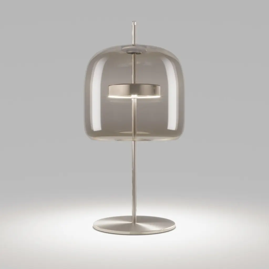 The elegant and delicate look of the blown glass finds a new dimension in Jube. Two glass units placed side by side, so perfectly assembled, that they look like a unique piece. A sinuous lamp, with tone-on-tone colours that give it a precious, vintage mood.Specifications:Material: GlassLight source: LED L2415 ULNo of bulbs: 1x13W L2415 UL (37V)Dimmer: DIM 4Lumen: 2000 lmKelvin: 2700 KYear: 2017Glass finish: Smoky TransparentFrame finish: Matt steelDimensions: Ø 26 x 55 H cmAvailable in other glass finish options: Light Amethyst Transparent, Crystal Transparent, Burned Earth Transparent, Old Green TransparentAvailable in other frame finish option: Matt gold 2Available in other light source option: LED L3415 UL - $ 1326Available in other kelvin option: 3000 KPlease inquire about customization options.