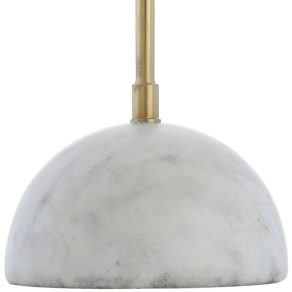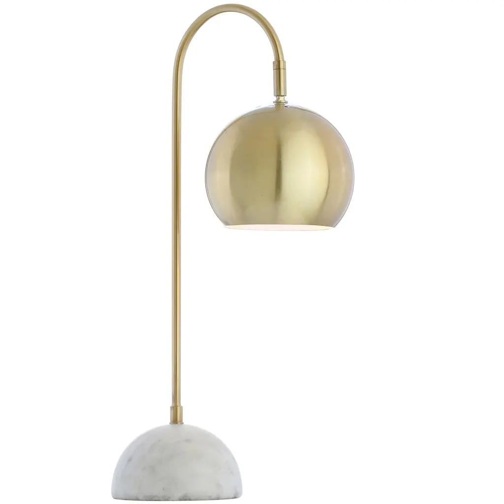 The marble base gives this retro-style table lamp a sense of classic gravitas, complemented by the lustrous brass finish of the arm and domed shade.