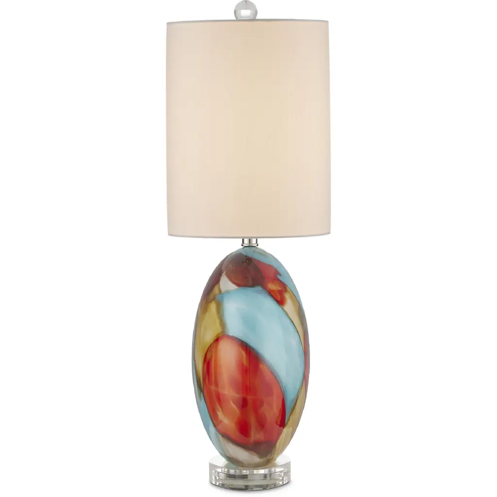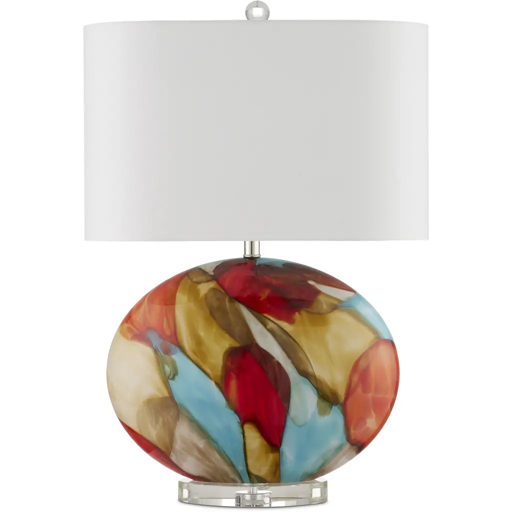 The Vivid Table Lamp lives up to its name with its swirling swaths of bright colors painted on its lozenge-shaped body. The multi-colored lamp glows even before it is fitted with an optic crystal base and finial, and polished nickel hardware. A polished design detail is how the shade is elongated in the same scale as the body and has rounded corners. The narrowness makes the lamp perfect for a spot where a fixture needs to sit close to the wall to free up tabletop space.