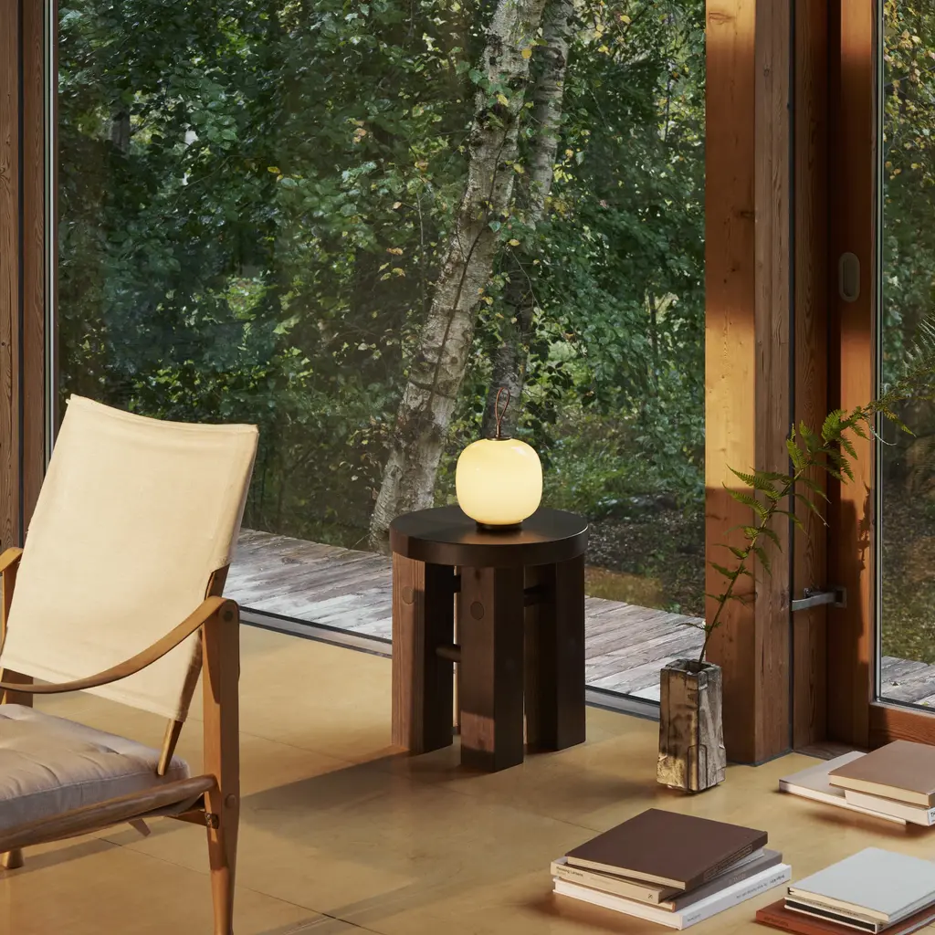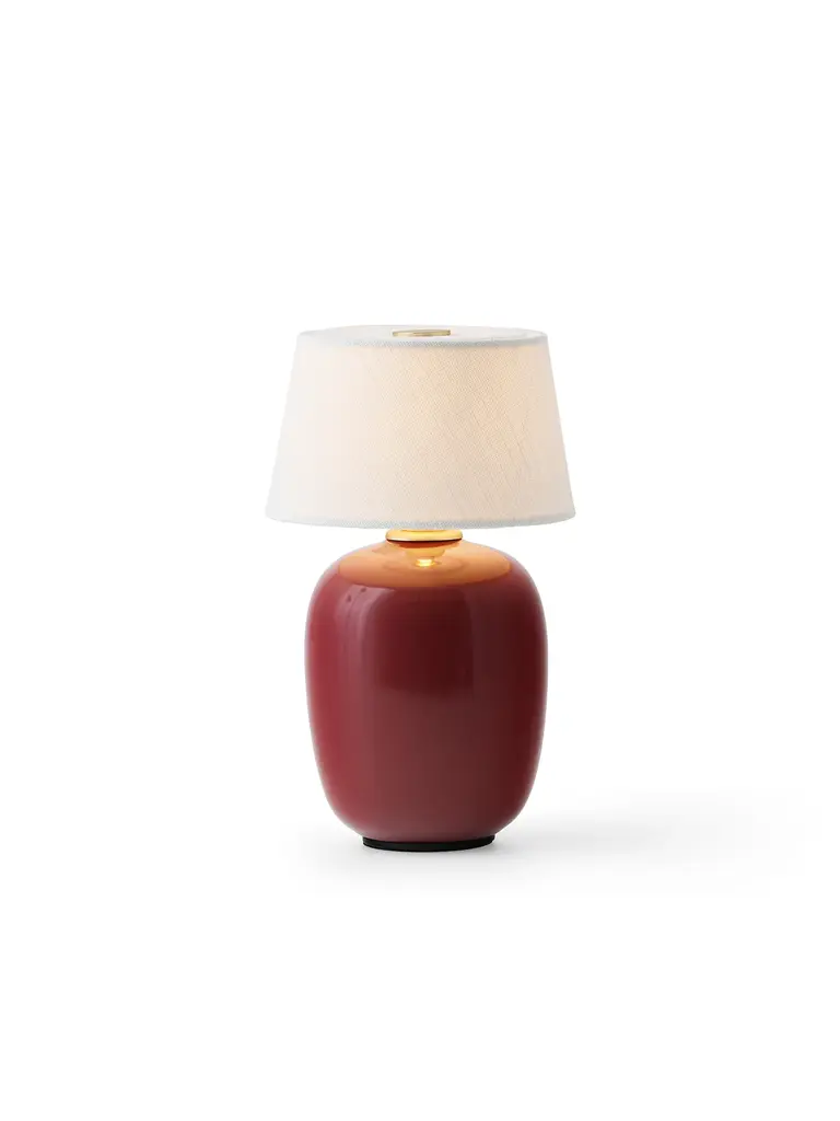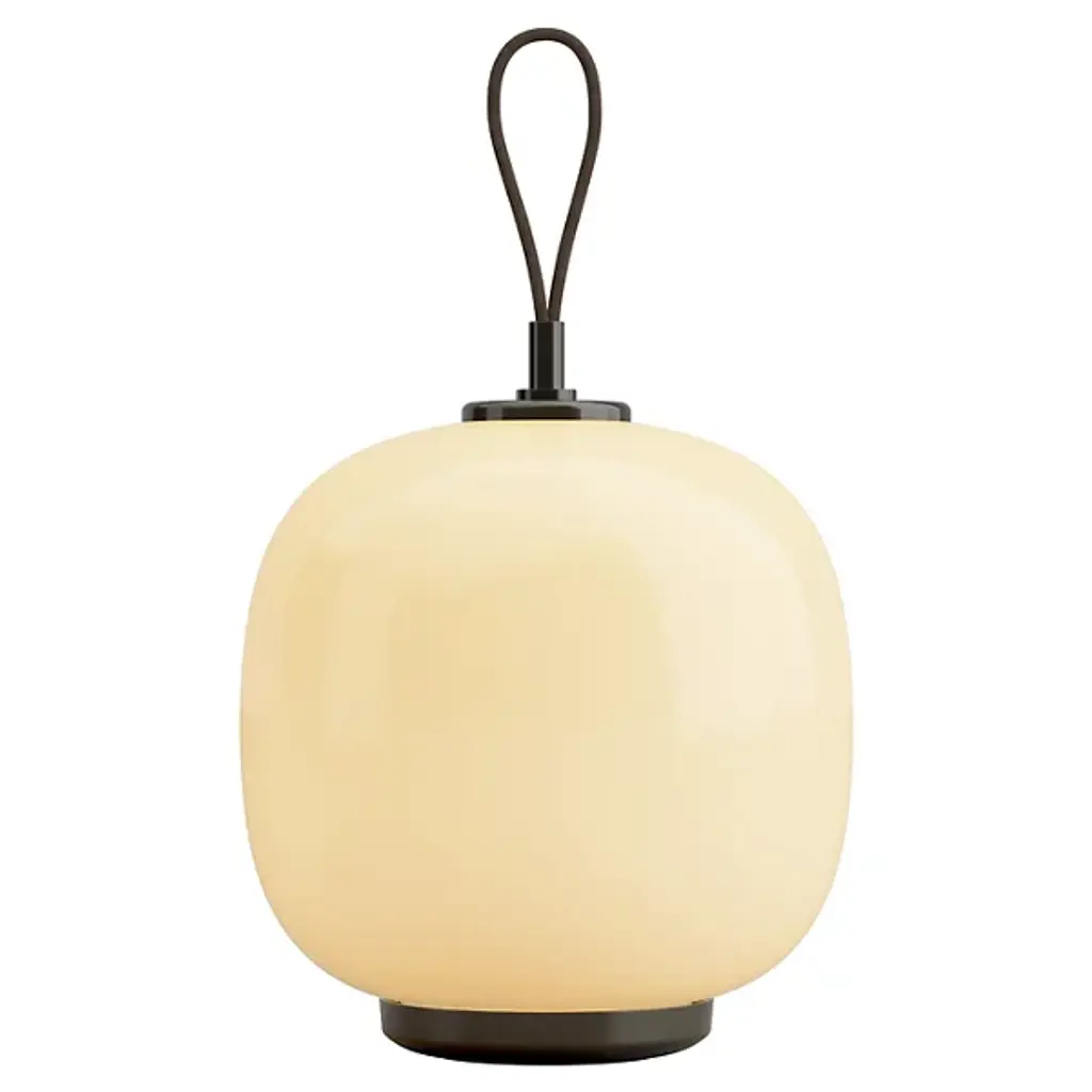 The VL45 Radiohus Portable Lamp features a rounded, mouth-blown opal glass shade that emits a soft, even light and is available in 3 colors. A brass base and top lend a refined look, while a leather strap ensures easy portability. Designed for use in both indoor and outdoor spaces.
