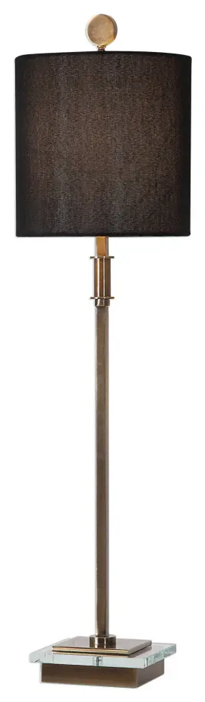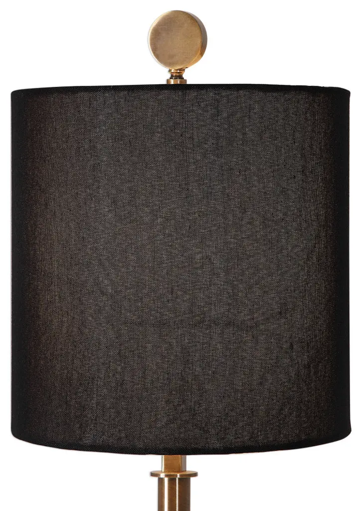 Sleek, modern lines complete this sophisticated design featuring a delicate iron base finished in a plated antique brass, accented with a thick crystal slab and a heavy disk finial. A round hardback drum shade in a black linen fabric completes this versatile piece.