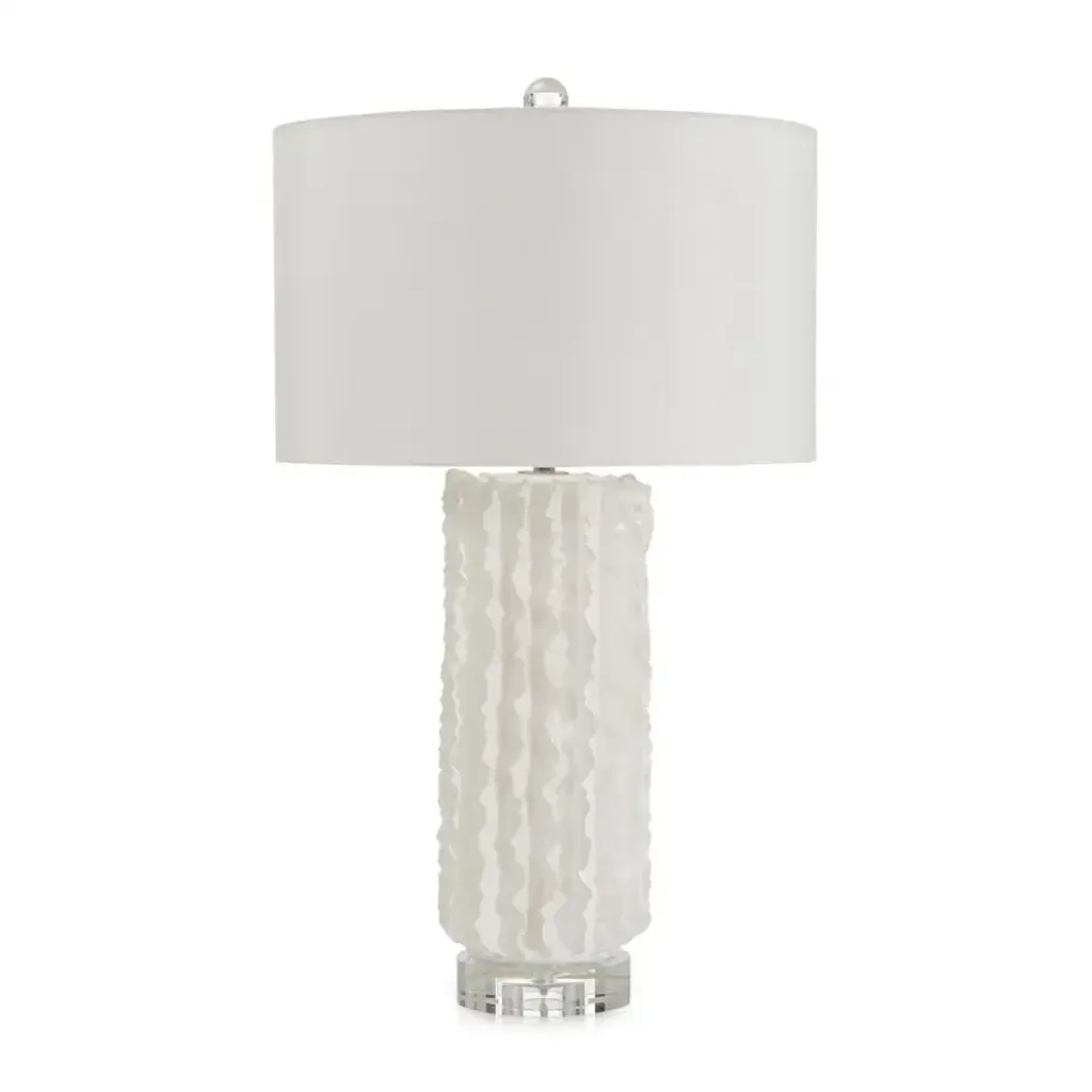 The Volante Table Lamp showcases a delicate sense of motion elevated by a pristine color palette that instills a serene atmosphere within any interior space. Crafted from white porcelain, the body showcases a sinuous profile that displays scalloped patterns. A small, rounded base of clear crystal complements the white hue of the body and matched by a crystal ball finial. The metallic neck hardware is adorned in an opulent polished nickel finish, completing the look of this innovative table lamp.