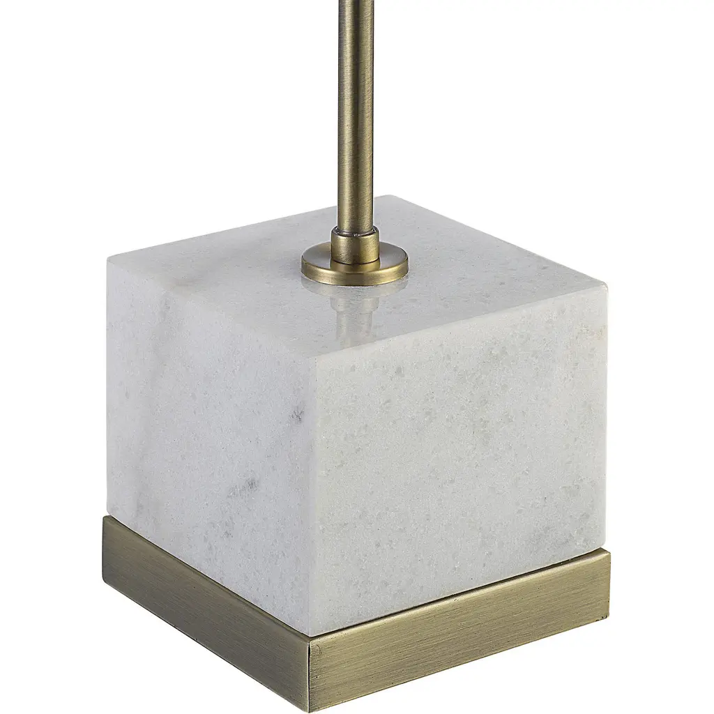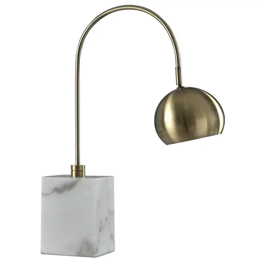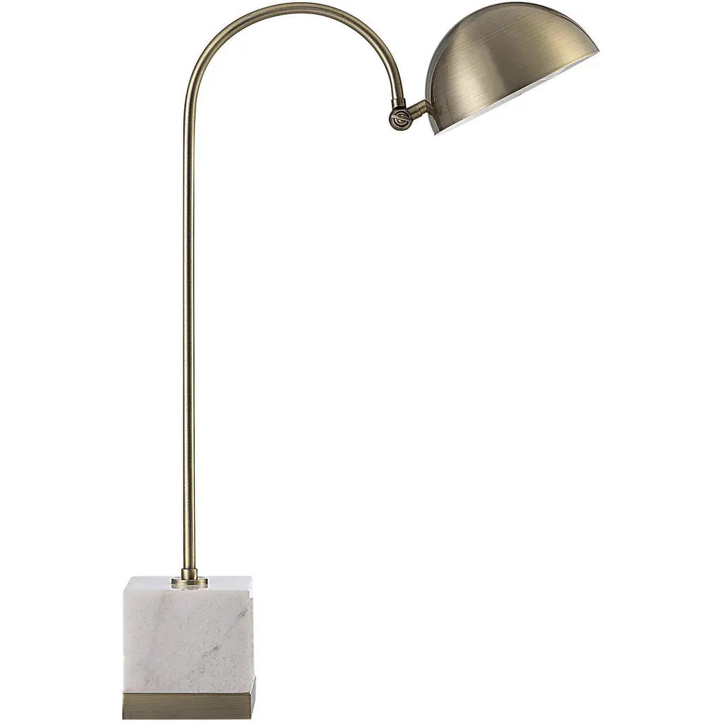 The home or business office takes on a luxe, designer quality when this table lamp enters the interior. Contrasting tones, textures and design details bring an intriguing element to this piece, allowing it to stand out without the need for additional accessories. The table lamp's antique brush brass finish, moveable dome and marble base combine beauty and purpose. Within the contemporary interior, it pairs equally well with wood and leather textiles as it does with metal and fabric.