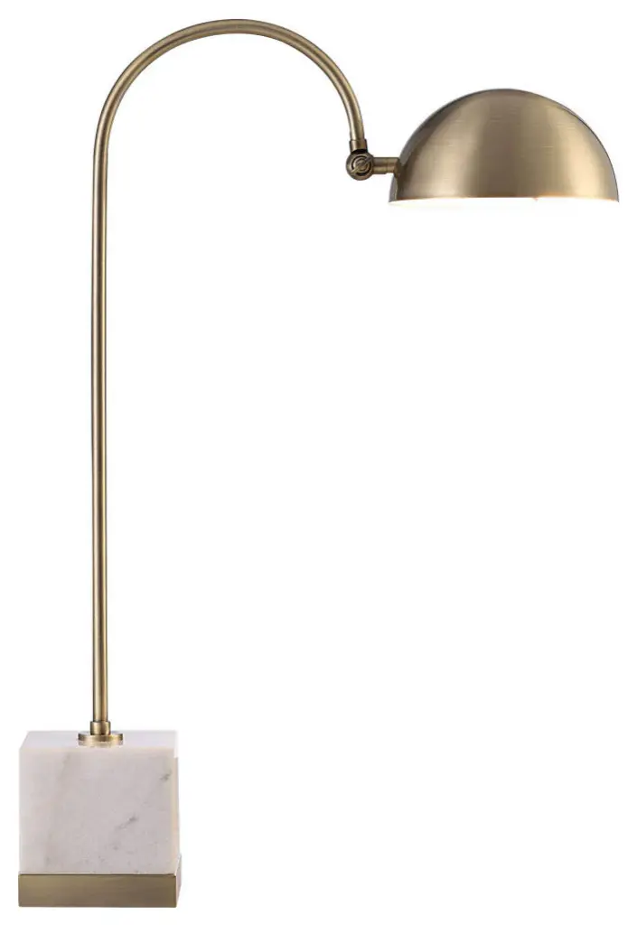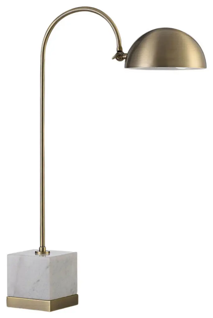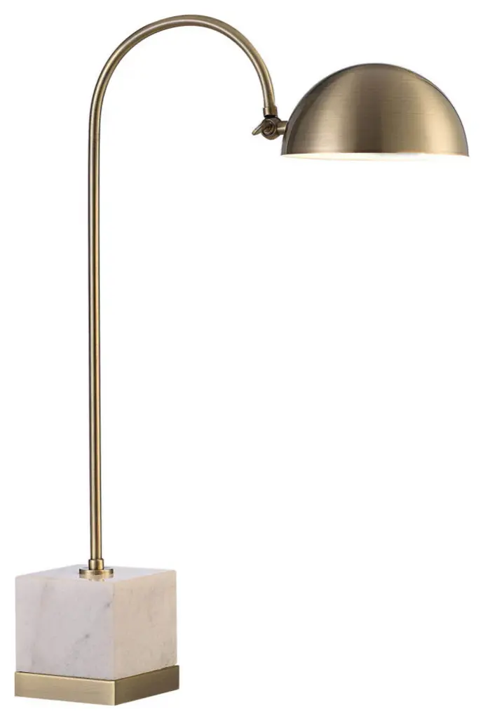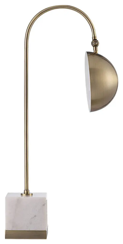 The home or business office takes on a luxe, designer quality when this table lamp enters the interior. Contrasting tones, textures and design details bring an intriguing element to this piece, allowing it to stand out without the need for additional accessories. The table lamp''s antique brush brass finish, moveable dome and marble base combine beauty and purpose. Within the contemporary interior, it pairs equally well with wood and leather textiles as it does with metal and fabric.