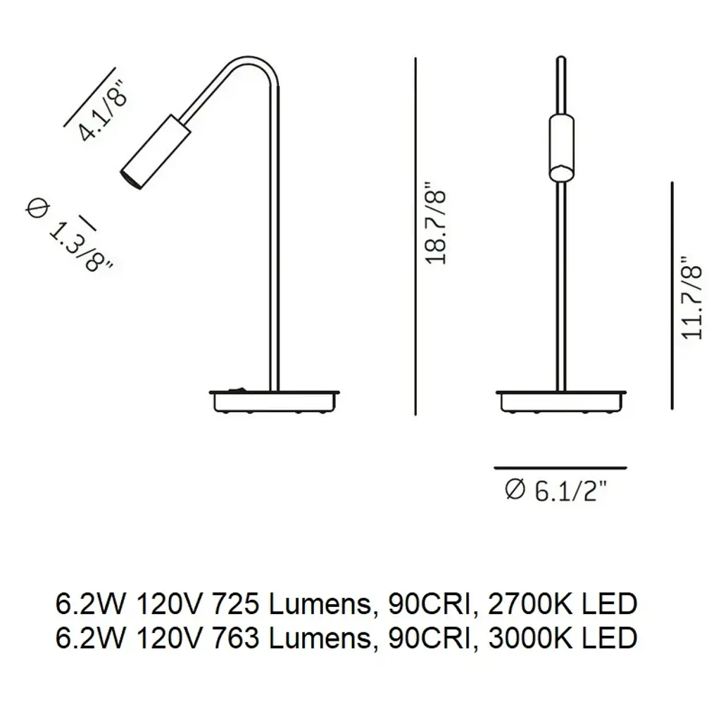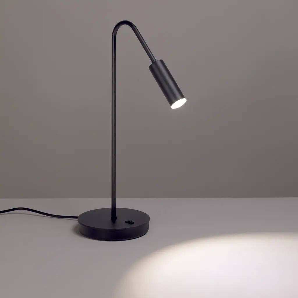 Table lamp with a cylindrical aluminum head and acrylic (PMMA) lens diffuser. Features