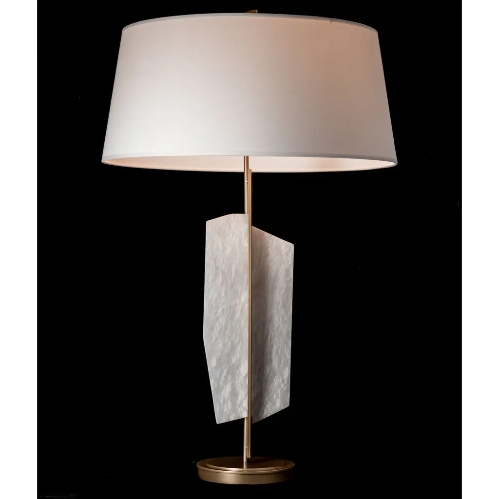 Natural alabaster stone is the focal point of the striking Volterra Table Lamp designed by Paul Marr Hilliard. The lustrous quality of the translucent white stone brings an elegance to the room. This tactile element intersects the strong steel body of this stunning shaded lamp.