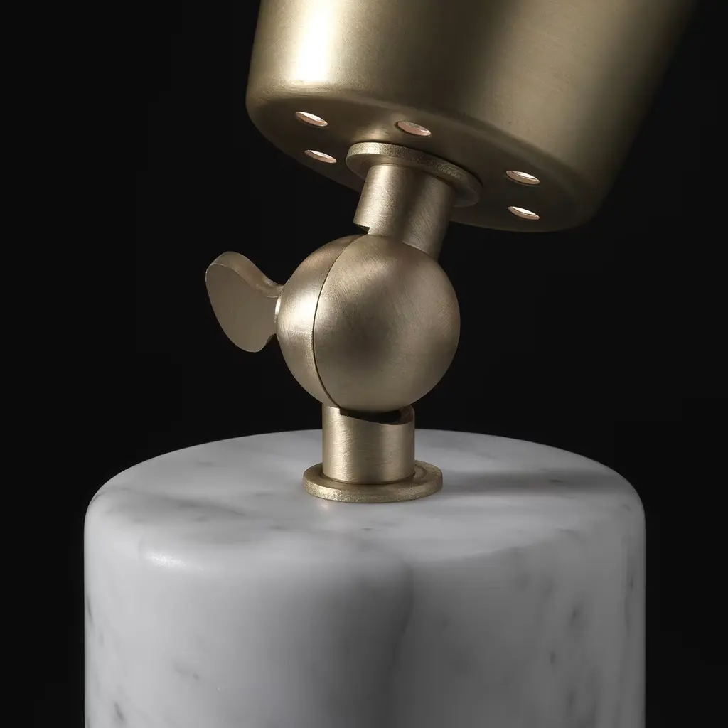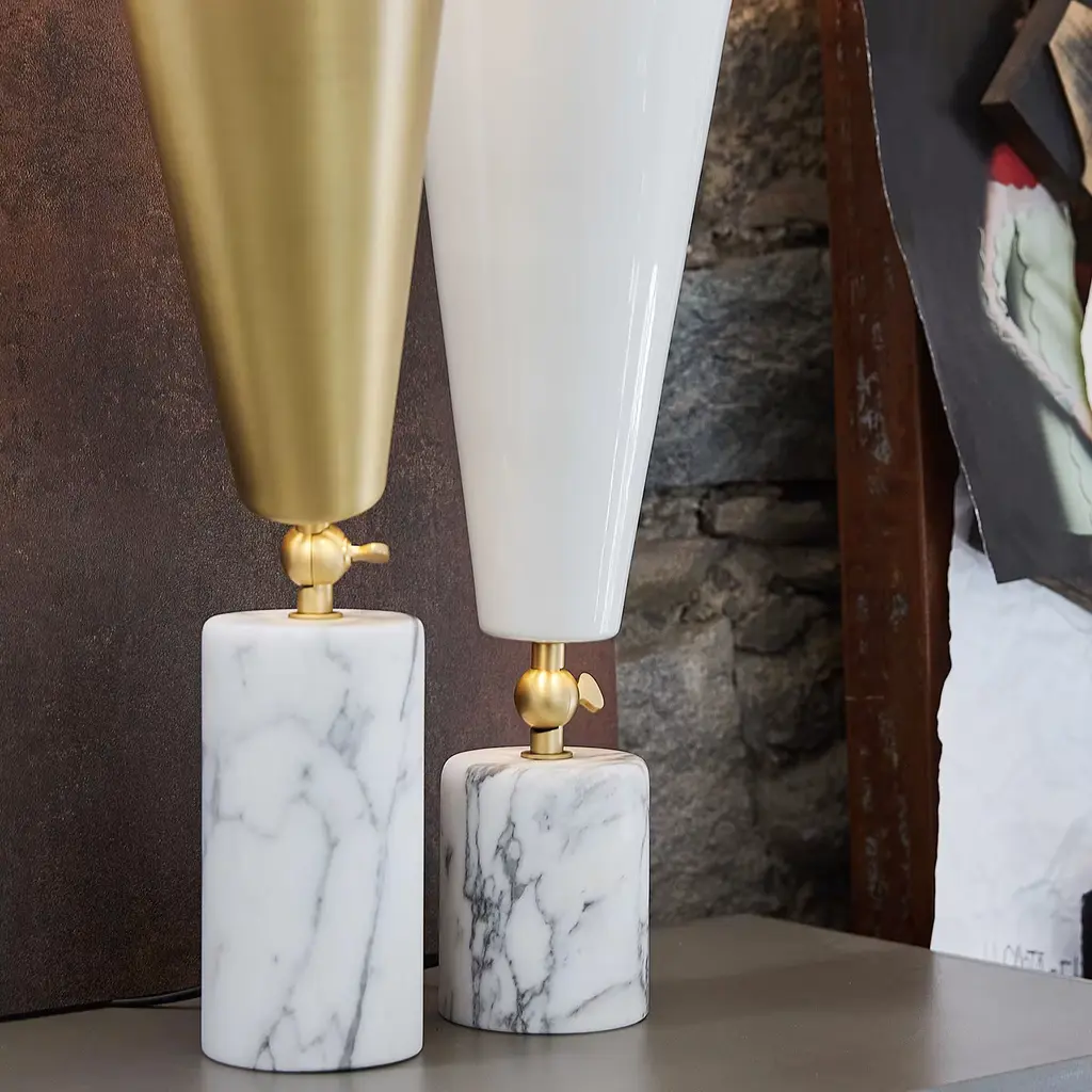 Part of the Vox collection by Lorenza Bozzoli, this table lamp is distinctive for its stunning Carrara marble cylindrical base, whose natural veins over the white background add a one-of-a-kind decorative element to the rigorous geometry of the lamp's silhouette. The conical shade is of satin-finished brass. This elegant and eye-catching piece is inspired by the concept of lightness, as expressed by Italo Calvino in one of his "Six Memos For the Next Millennium", where lightness is not superficiality, but the opposite of oppressiveness.