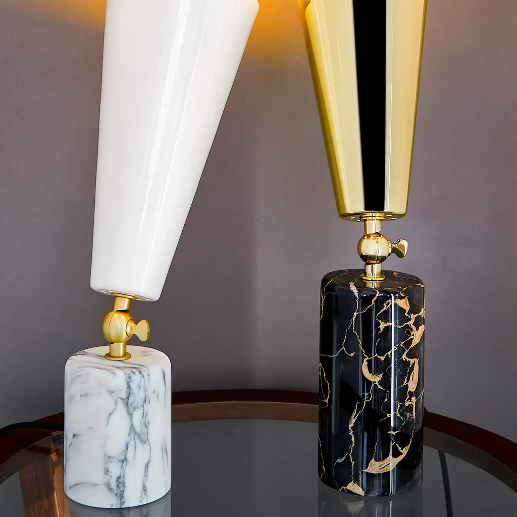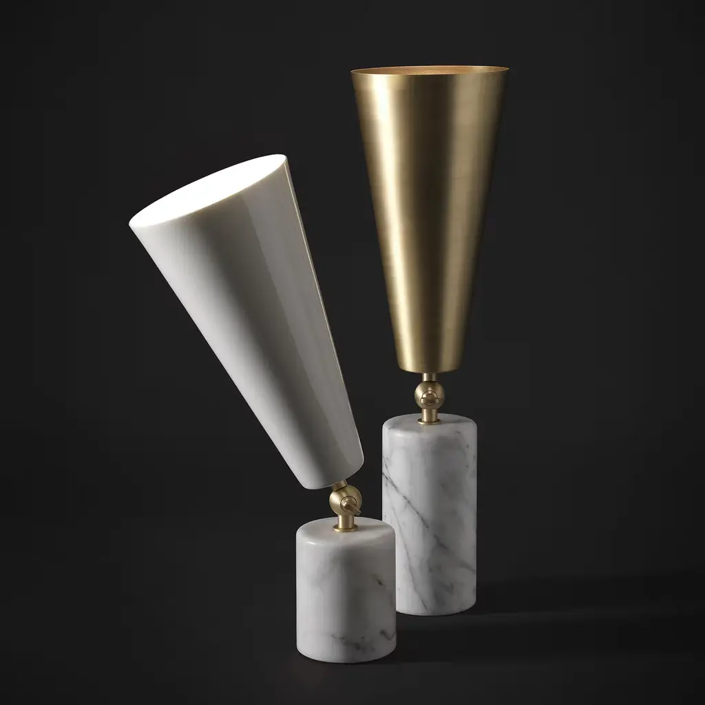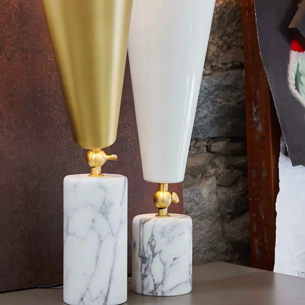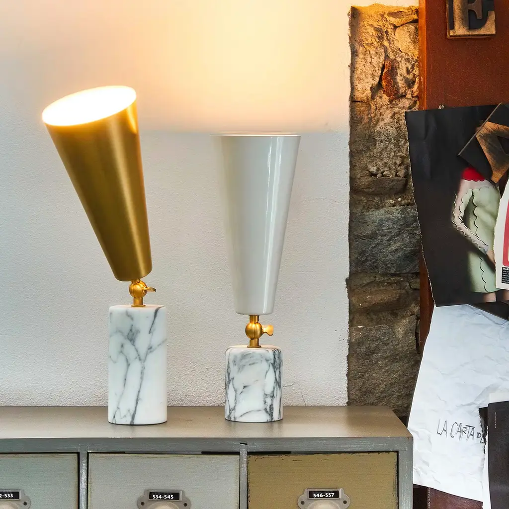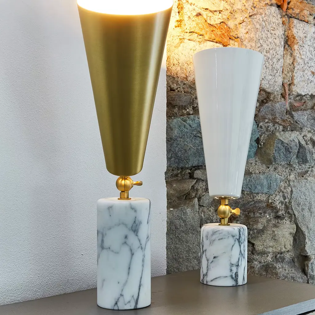 This striking table lamp features geometrical shapes complemented by precious materials. The cylindrical base is in Carrara marble and the joint that connects it to the white glass shade is in brass with a satin finish.