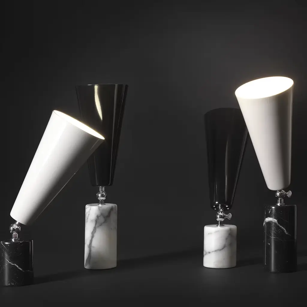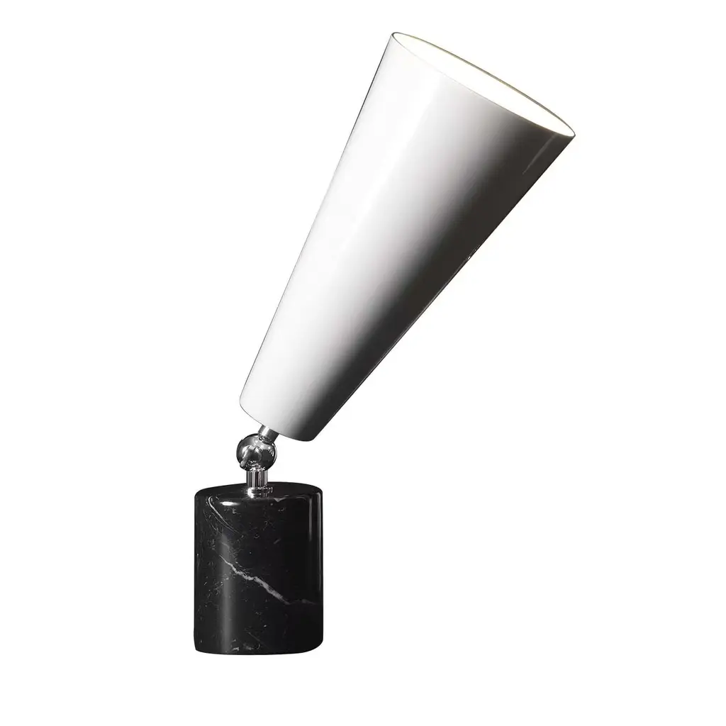 Either alone or paired with the Vox Bassa Table Lamp by Lorenza Bozzoli in Marquina marble, this stunning table lamp will make an elegant statement in a minimalist and modern decor. Its interplay of different geometric shapes and contrasting textures, and the black and white color block combination make it a superb piece of functional decor. The cylindrical base is of white Carrara marble, while the conical shade is finished in glossy black.