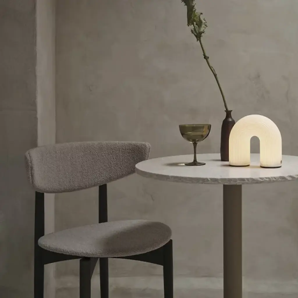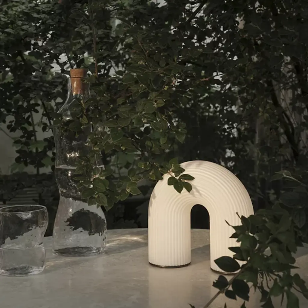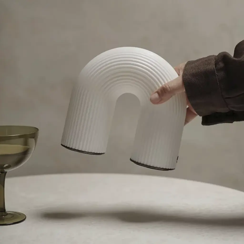 The Vuelta LED Rechargeable Table Lamp from ferm LIVING features a sculptural arc reminiscent of ancient columns. Created for portability, this product is a testament to high-quality craftsmanship and is made of durable plastic, making it exceptionally versatile. It boasts an LED light source that emits a soft, diffused glow and includes a dimmer switch for ambiance control. This table lamp is multifaceted, working as a nightlight for a child or a subtle accent to illuminate a dark corner.