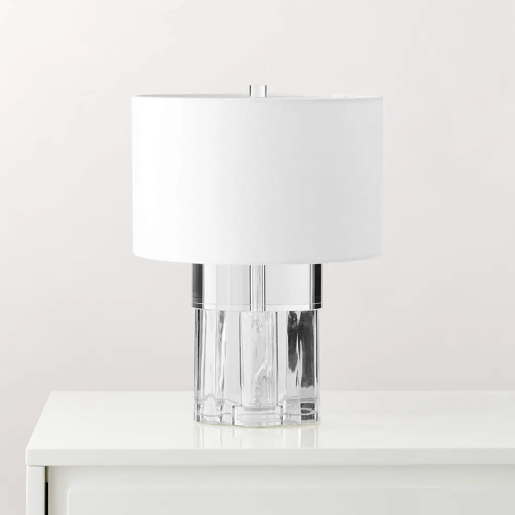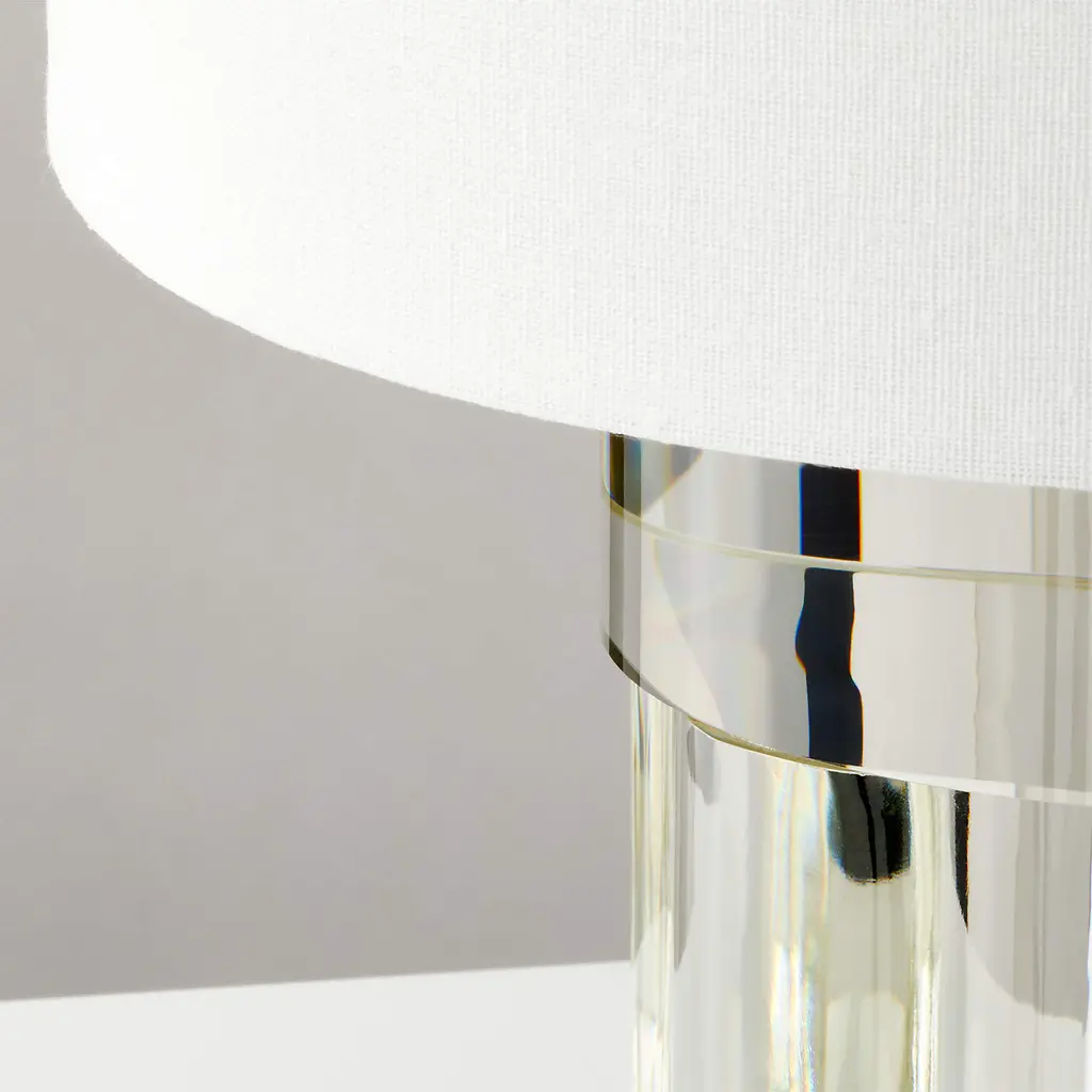 Designed by Jannis Ellenberger, carved crystal table lamp makes a sculptural statement in petite form. Crisp and clear, the crystal base is accented with thoughtful details, including a linen shade and a matching decorative crystal finial. CB2 exclusive.