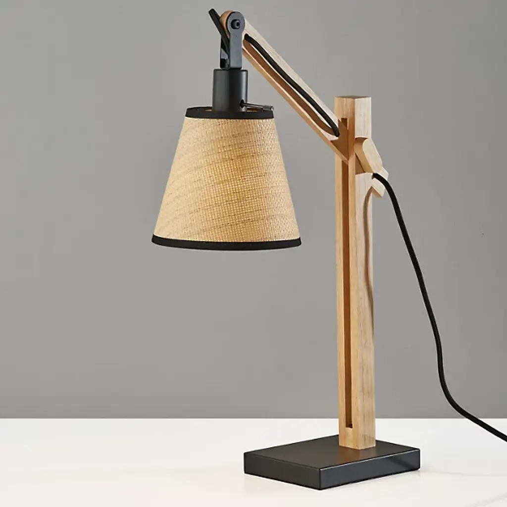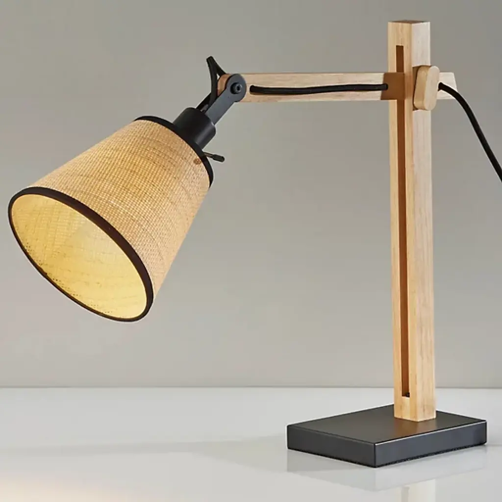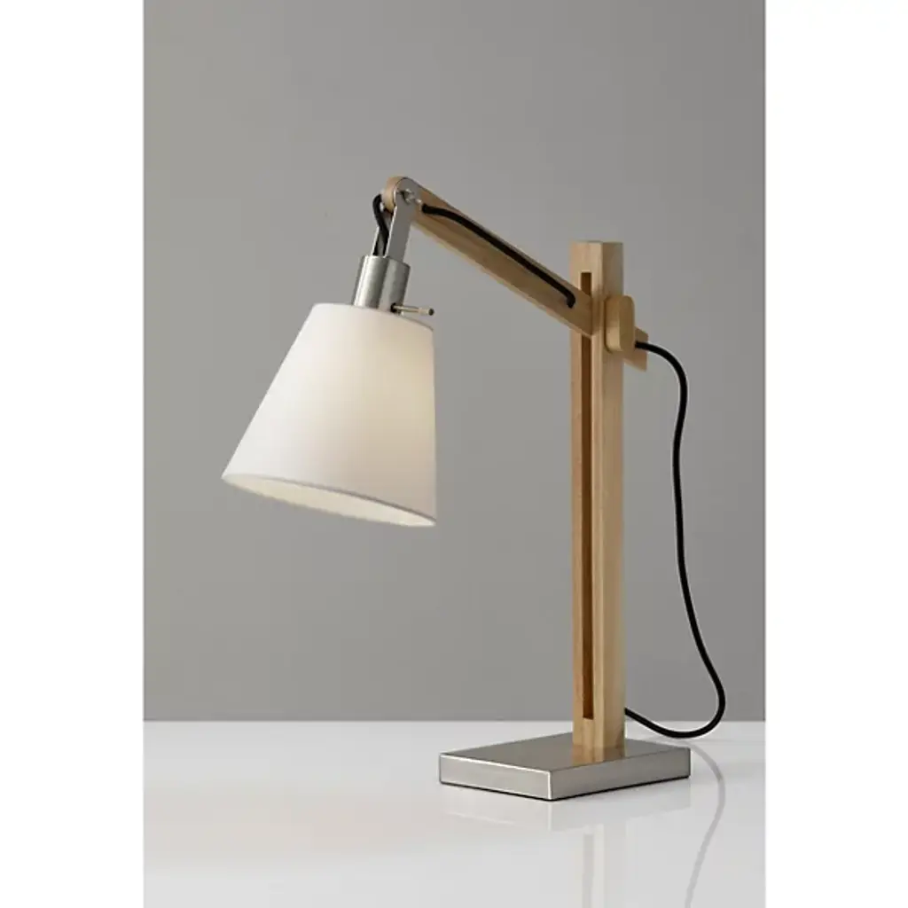Brighten your living spaces with the stylish and stately presence of the Walden Table Lamp from Adesso. A charming construction that blends industrial practicality with a charming rustic character, it uses a satin steel base and socket with a slender rotary switch to add sleek, refined notes to the smooth wood of the stem and posable arm. The socket base and lamping are surrounded by a flaring fabric shade, left open at the bottom for a pool of focused light, while the light passing through the shade’s translucent sides creates a pleasant glow around the fixture.