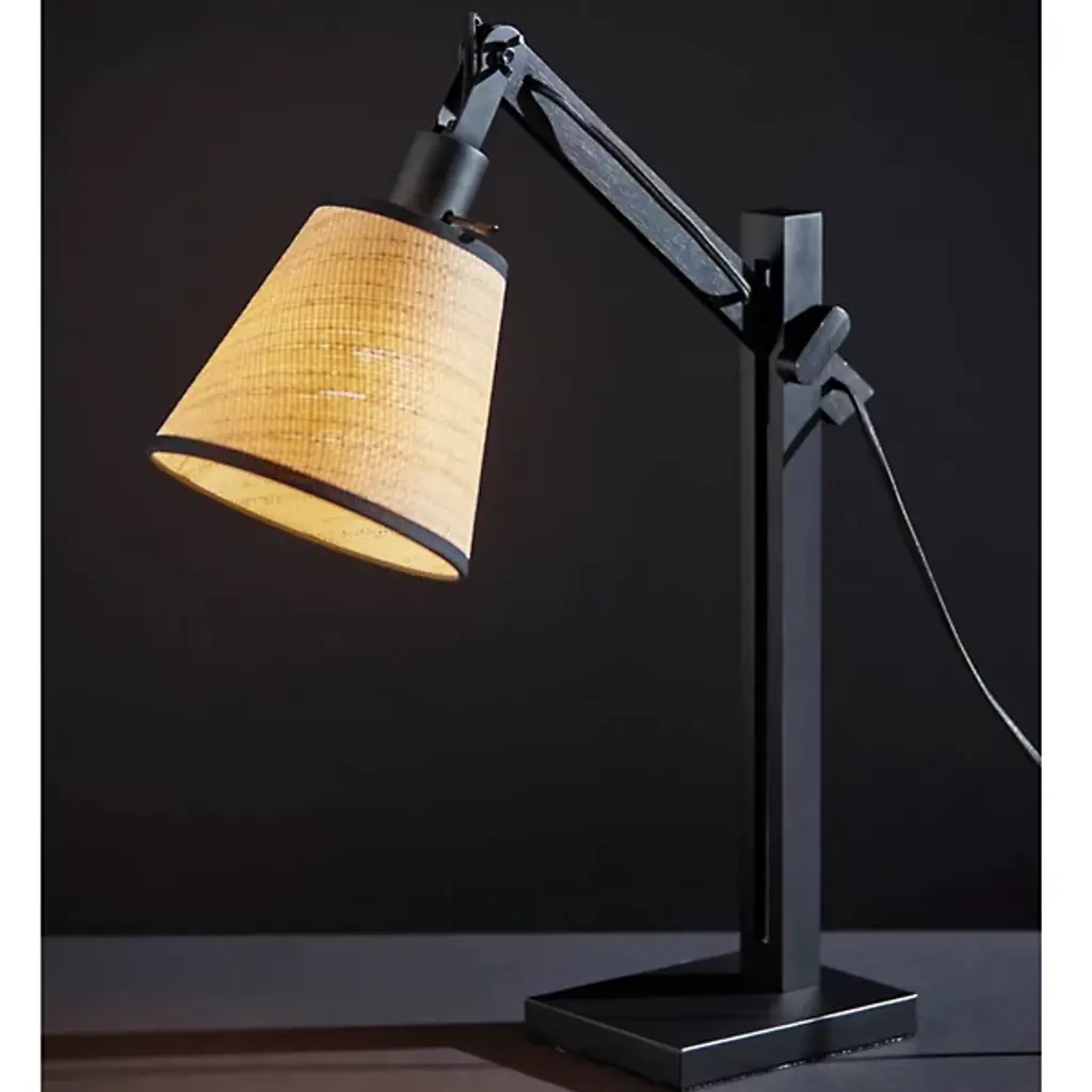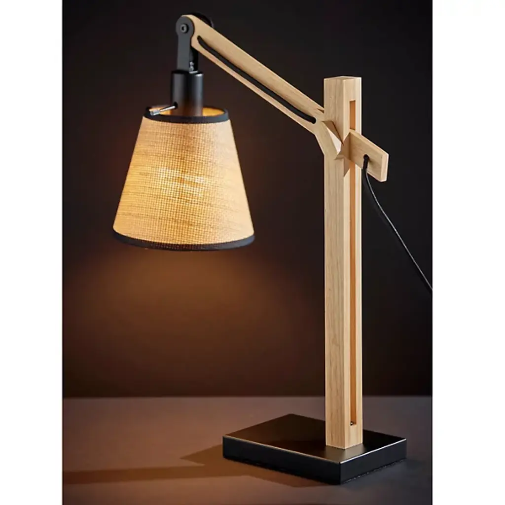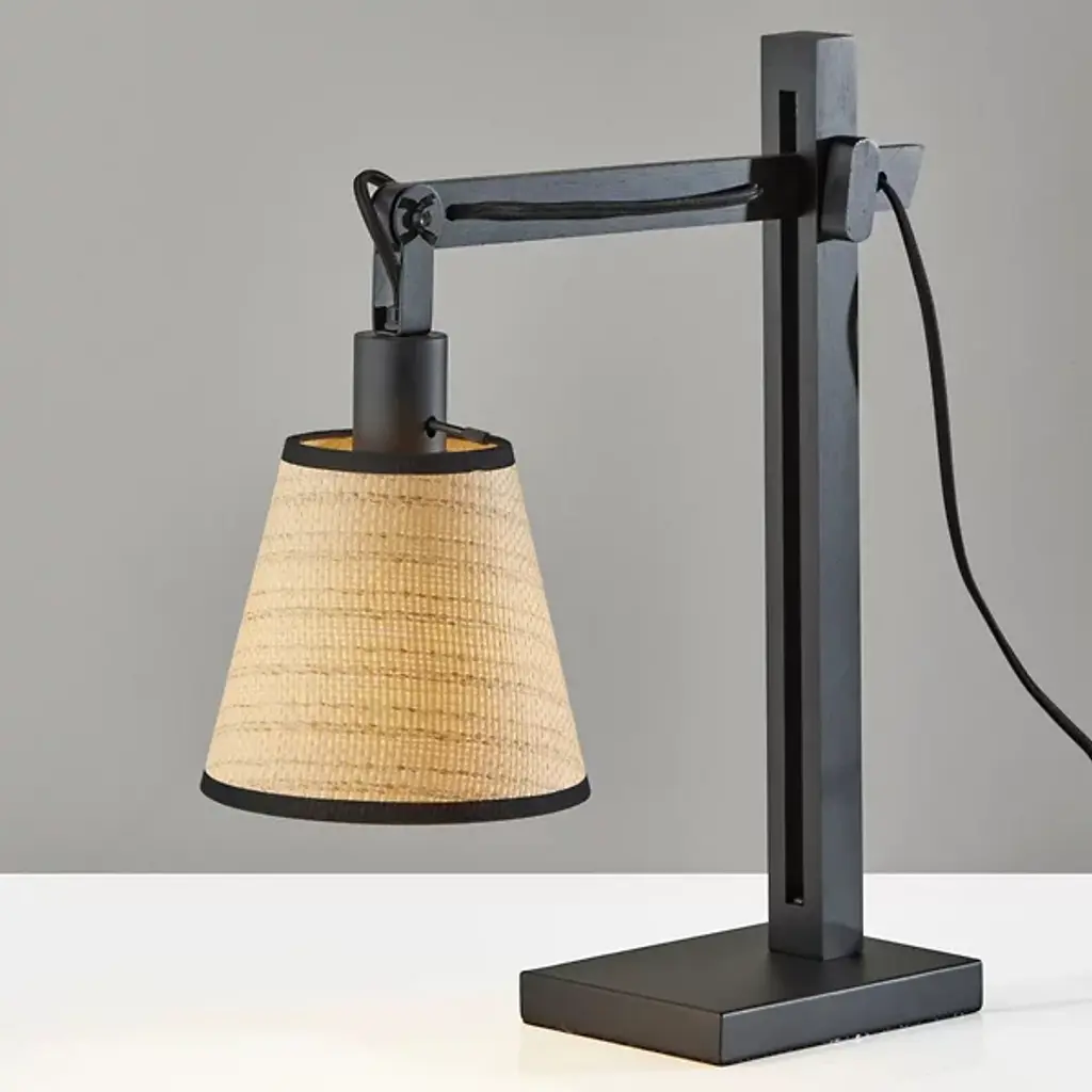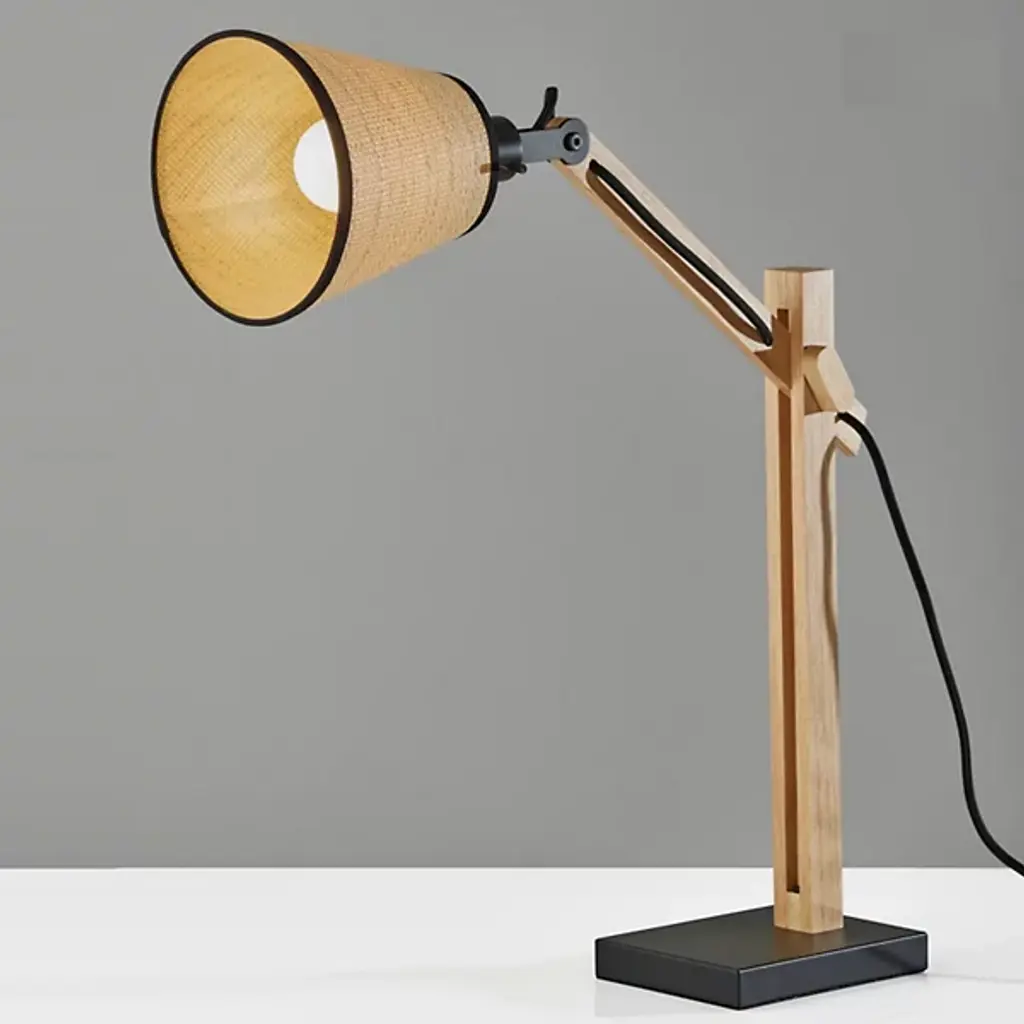 Brighten your living spaces with the stylish and stately presence of the Walden Table Lamp from Adesso. A charming construction that blends industrial practicality with a charming rustic character, it uses a satin steel base and socket with a slender rotary switch to add sleek, refined notes to the smooth wood of the stem and posable arm. The socket base and lamping are surrounded by a flaring fabric shade, left open at the bottom for a pool of focused light, while the light passing through the shade’s translucent sides creates a pleasant glow around the fixture.