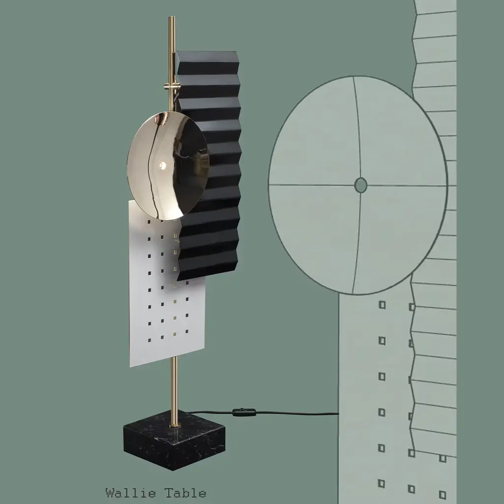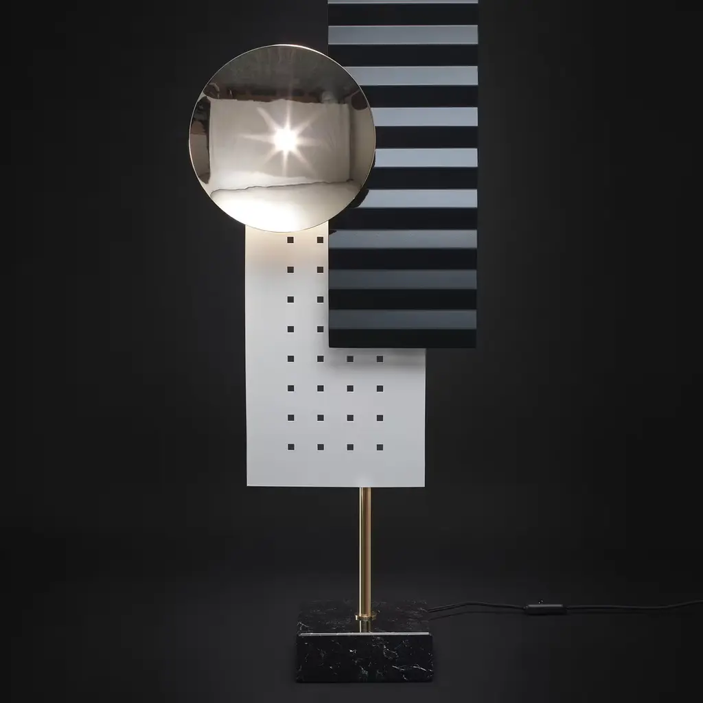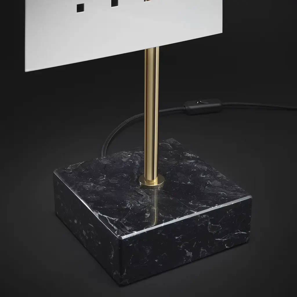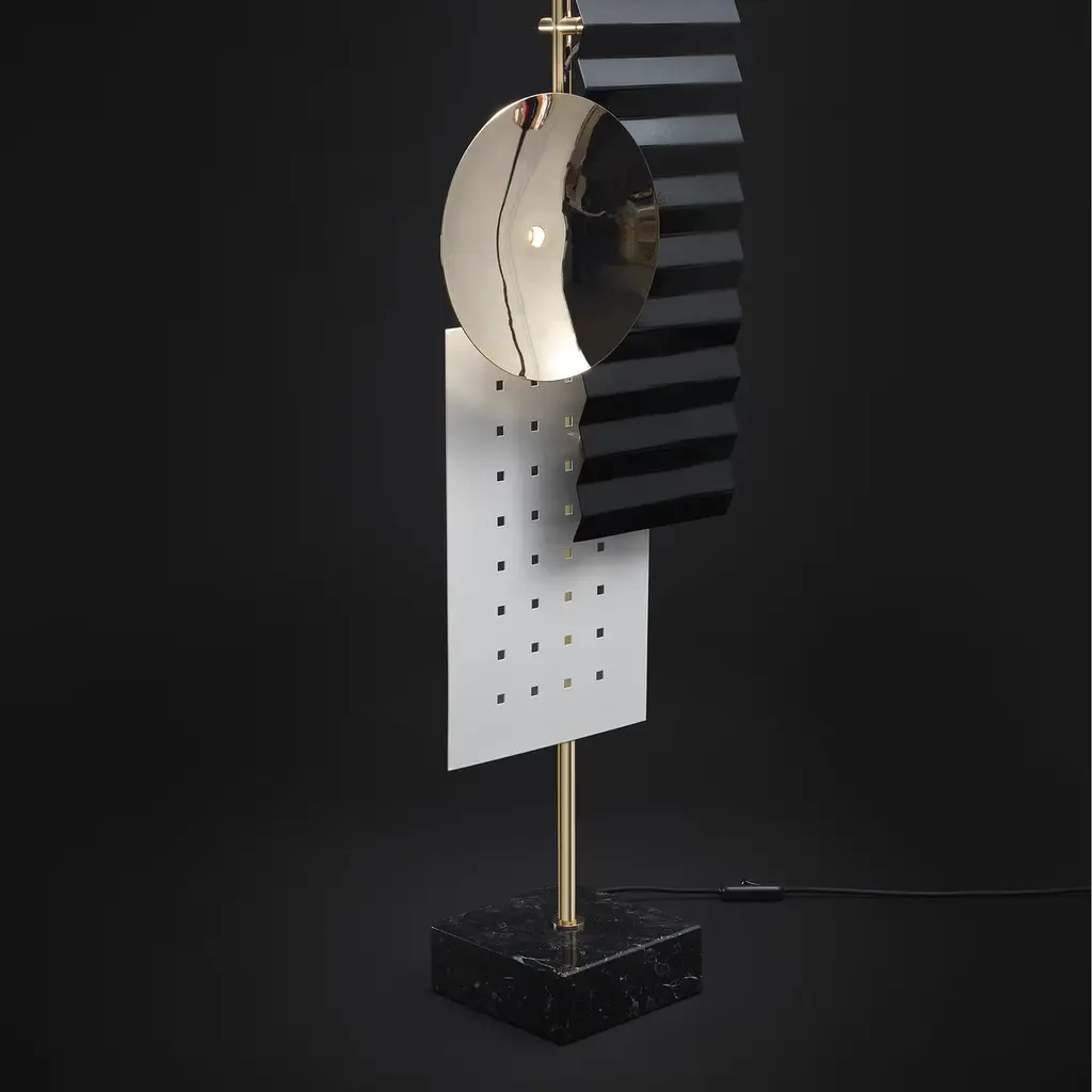This elegant, sculptural table lamp designed by Lorenza Bozzoli is meant to be set against the wall. The base is black Marquina marble, and the body is steel and brass. The lamp shade is perforated and pleated steel, painted white. Can also be ordered in brass/white/black.