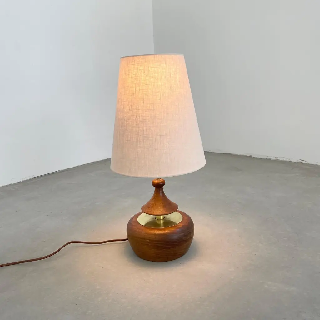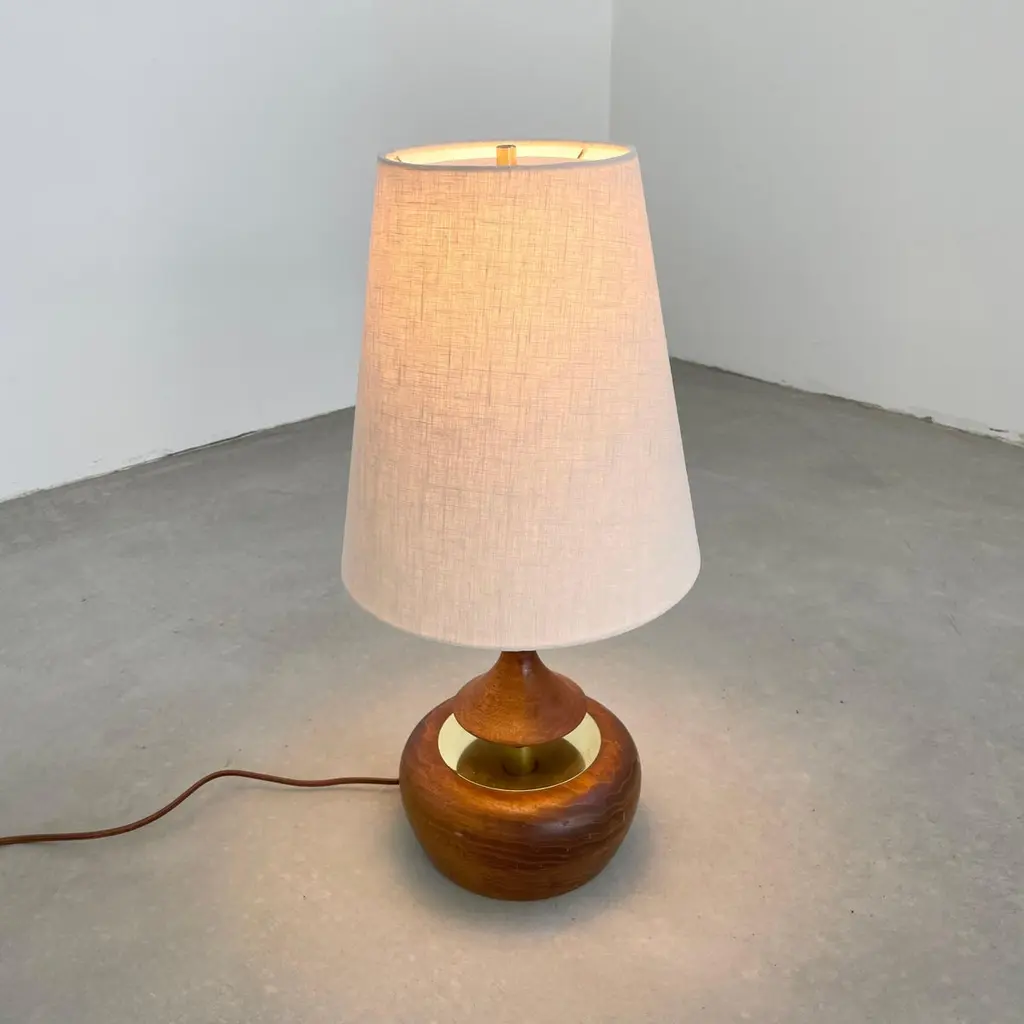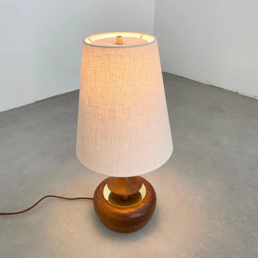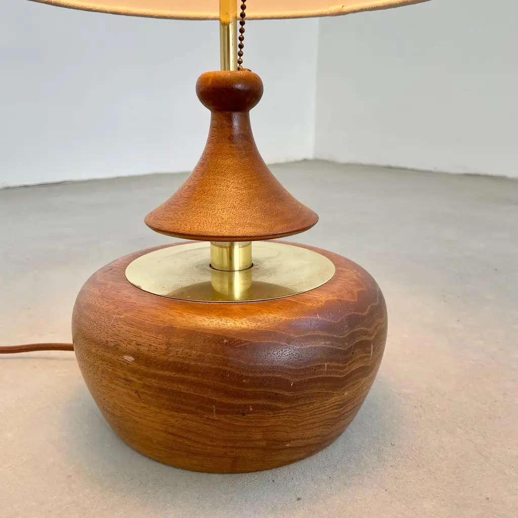 Sculptural table lamp in walnut and brass by Modeline of California. Beautiful lines and materials give this lamp timeless style and character. The lamp operates by a suspended walnut disk in the middle of the shaft of the lamp which is pushed down to turn lamp on and off. Perfect as a bedside table lamp, and for reaching in the dark. Simple, elegant design to elevate any nightstand or side table. Comes with new custom linen shade.