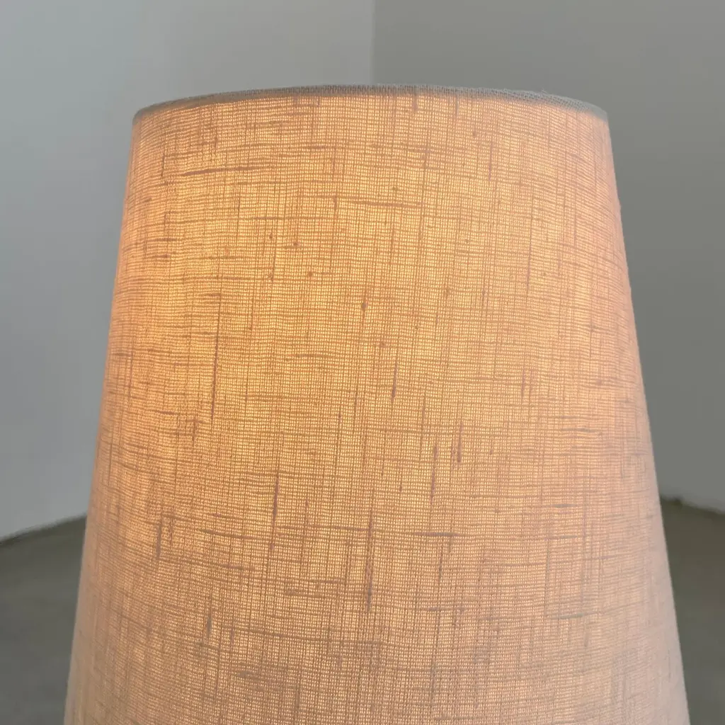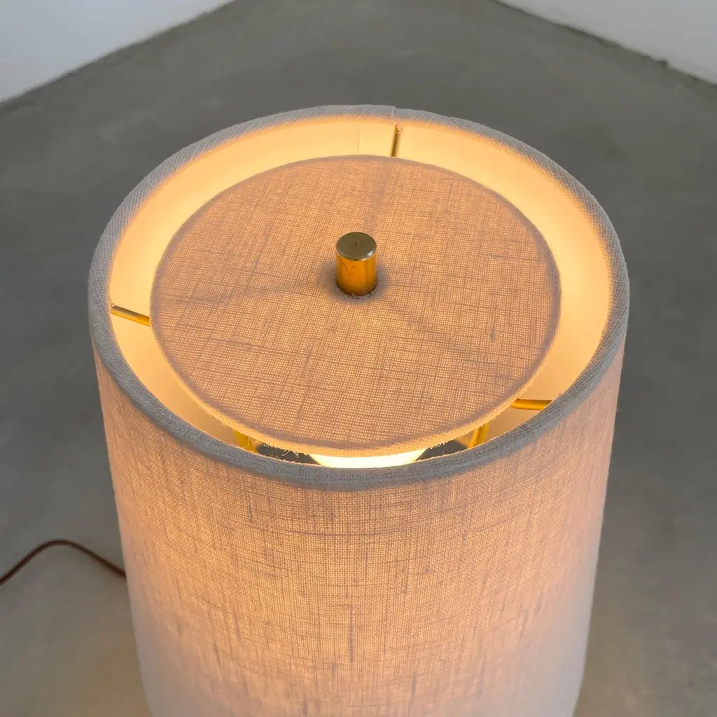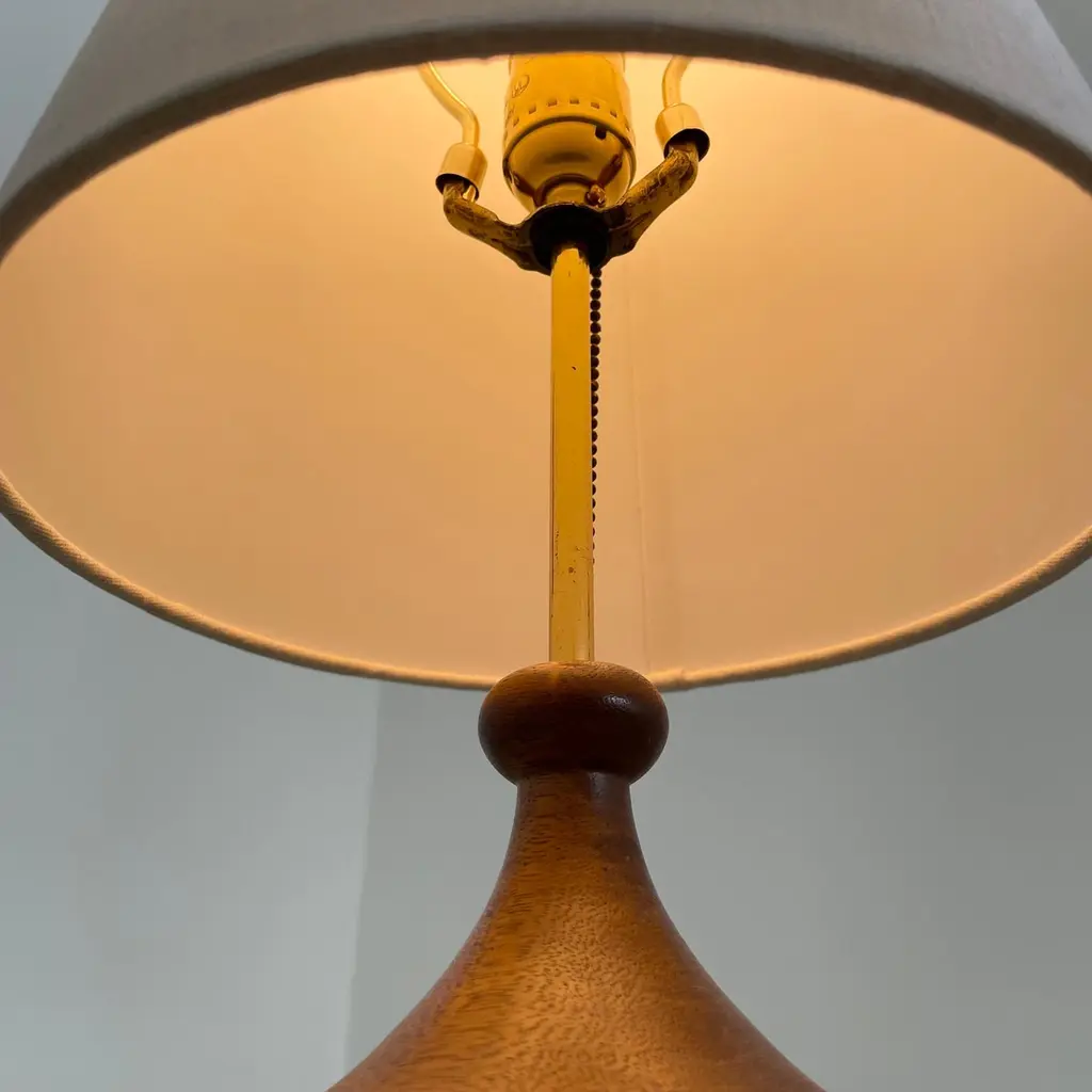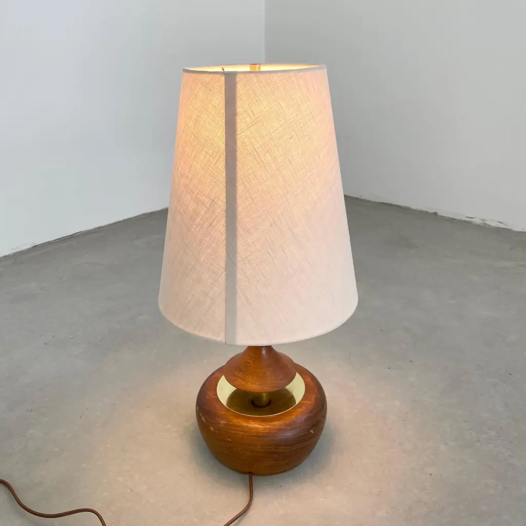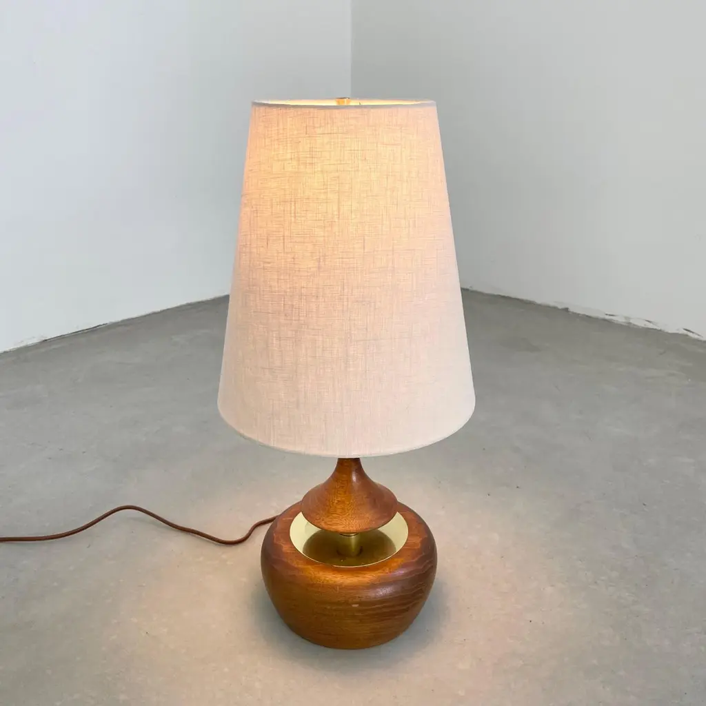 Sculptural table lamp in walnut and brass by Modeline of California. Beautiful lines and materials give this lamp timeless style and character. The lamp operates by a suspended walnut disk in the middle of the shaft of the lamp which is pushed down to turn lamp on and off. Perfect as a bedside table lamp, and for reaching in the dark. Simple, elegant design to elevate any nightstand or side table. Comes with new custom linen shade.