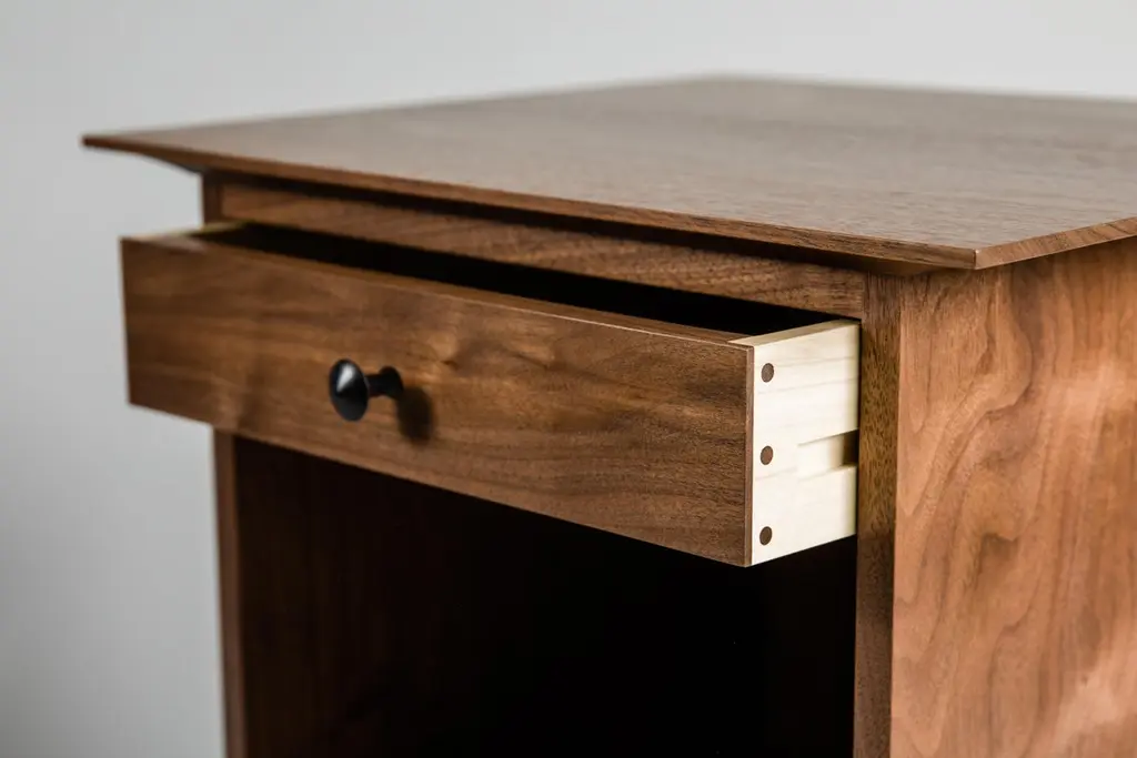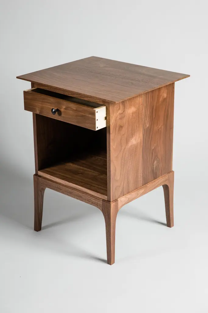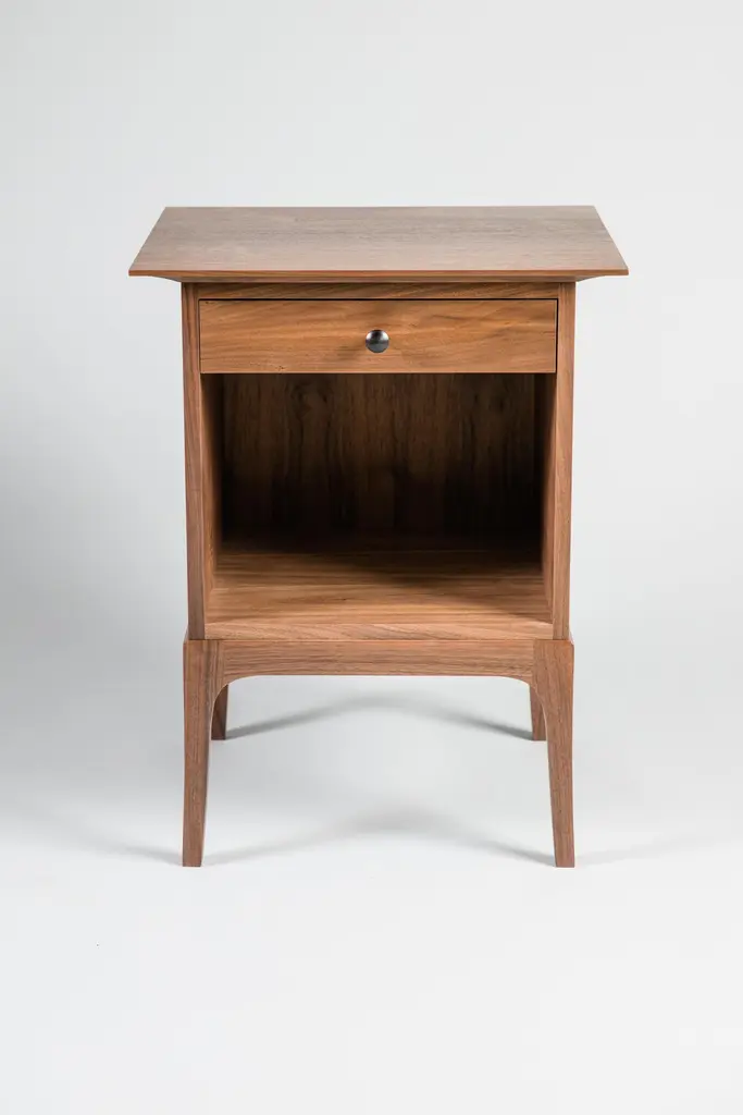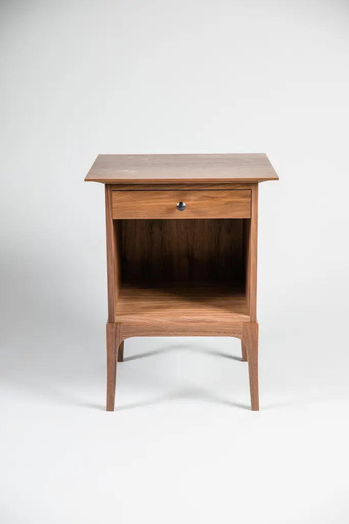 The Glendale nightstand is made of solid walnut with a poplar drawer. The details are carefully designed and executed to work harmoniously with the whole piece. Sleek curves and coves give the piece a sculptural quality, lightening its visual weight and creating interest. The top is large enough to hold stacks of books and a lamp yet small enough to fit in a variety of bedrooms. Can also work as living room side tables.Can be made in walnut, cherry, or white oak.One order includes one nightstand. Order two for a pair.Dimensions: 26” tall, 20” wide, 17.5” deepDesigned and built by Meredith Hart Furniture in North Carolina.