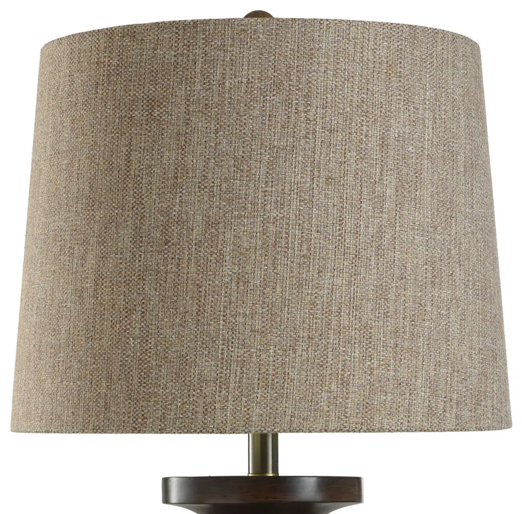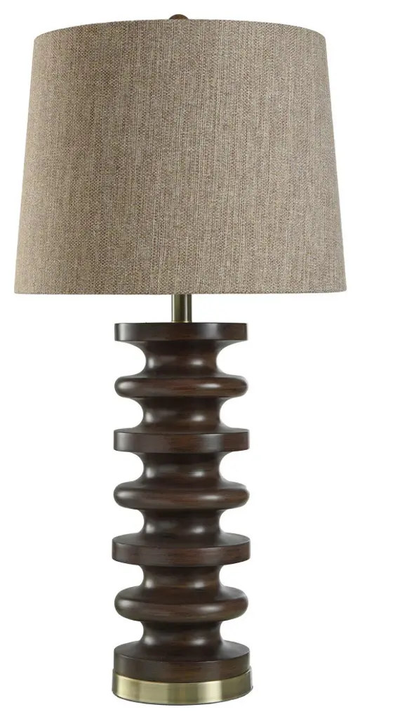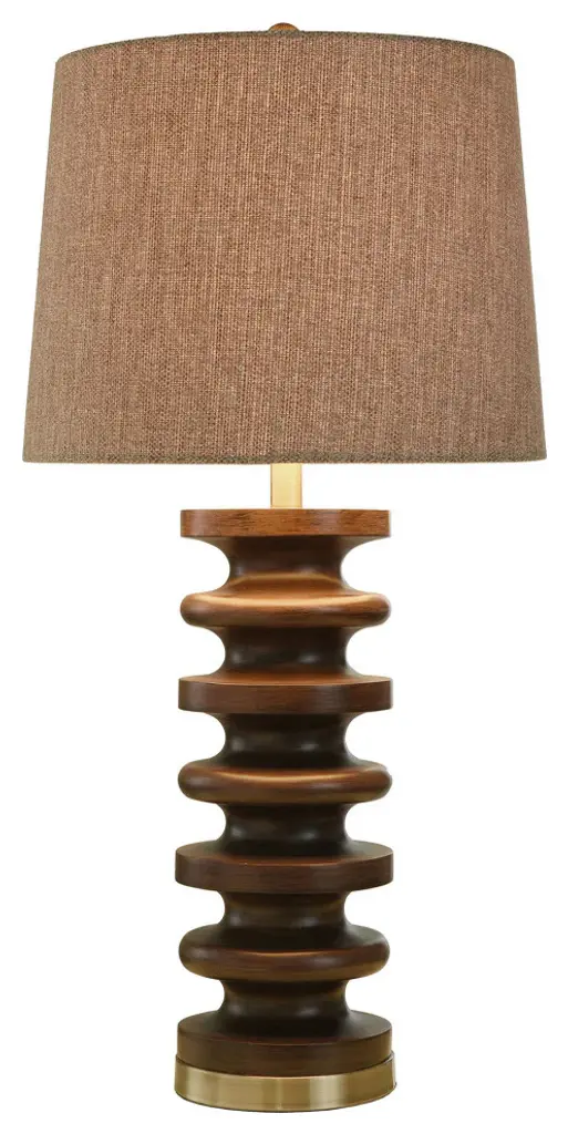 Cast the perfect ambiance in your home with this beautifully crafted lighting. This polyresin table lamp features a unique modern fish bone body and a dark brown faux wood finish with brass accents. The light brown tapered drum shade pairs perfectly with the lamp base creating a stunning mid-century modern look.Features - Due to the production process, each piece is unique and no two are exactly alike.Light up your home with a piece that is stunning, this table lamp showcases modern design and a unique shape in its polyresin base.Finished in a dark brown faux walnut and featuring aged brass accents, this is a piece that is sure to elevate your home design.Number of Bulbs: 1Wattage: 150WBulb Type: Incandescent, Fluorescent, or Equivalent.Bulb(s) not includedDue to lighting and monitor differences, actual colors and finishes may vary slightly from what appears online.