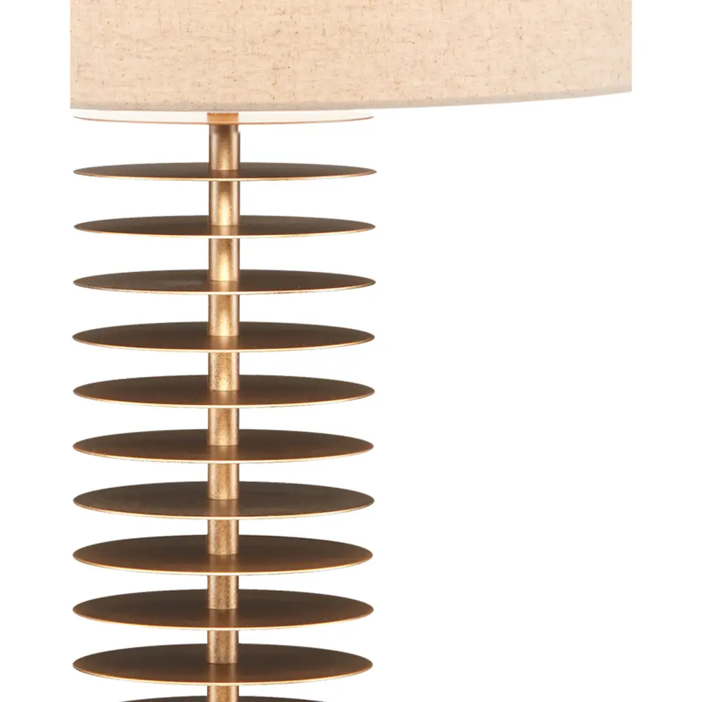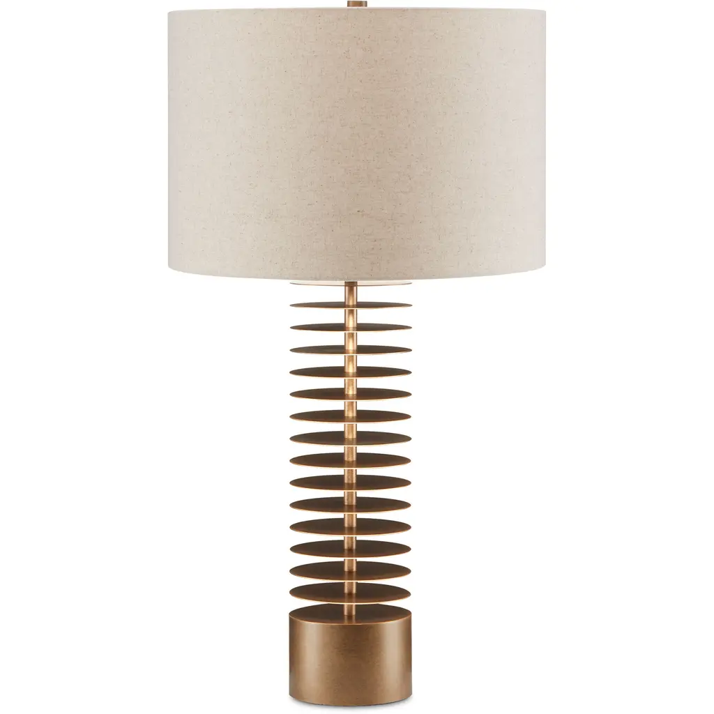 About the Walwyn Table Lamp, Ian Thornton explains he was eager to explore horizontal lines given lamp bodies are usually created from vertical lines: “The equally spaced 16 disks remind me of a skyscraper being built before the walls are put in place. This contemporary design will feel at home in any modern interior.” The painted antique brass finish brings the gold table lamp added warmth, as does the slightly textural fabric of the shade.