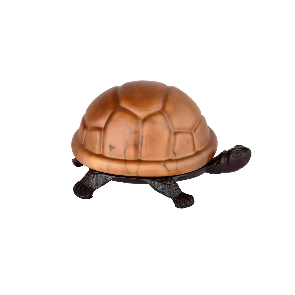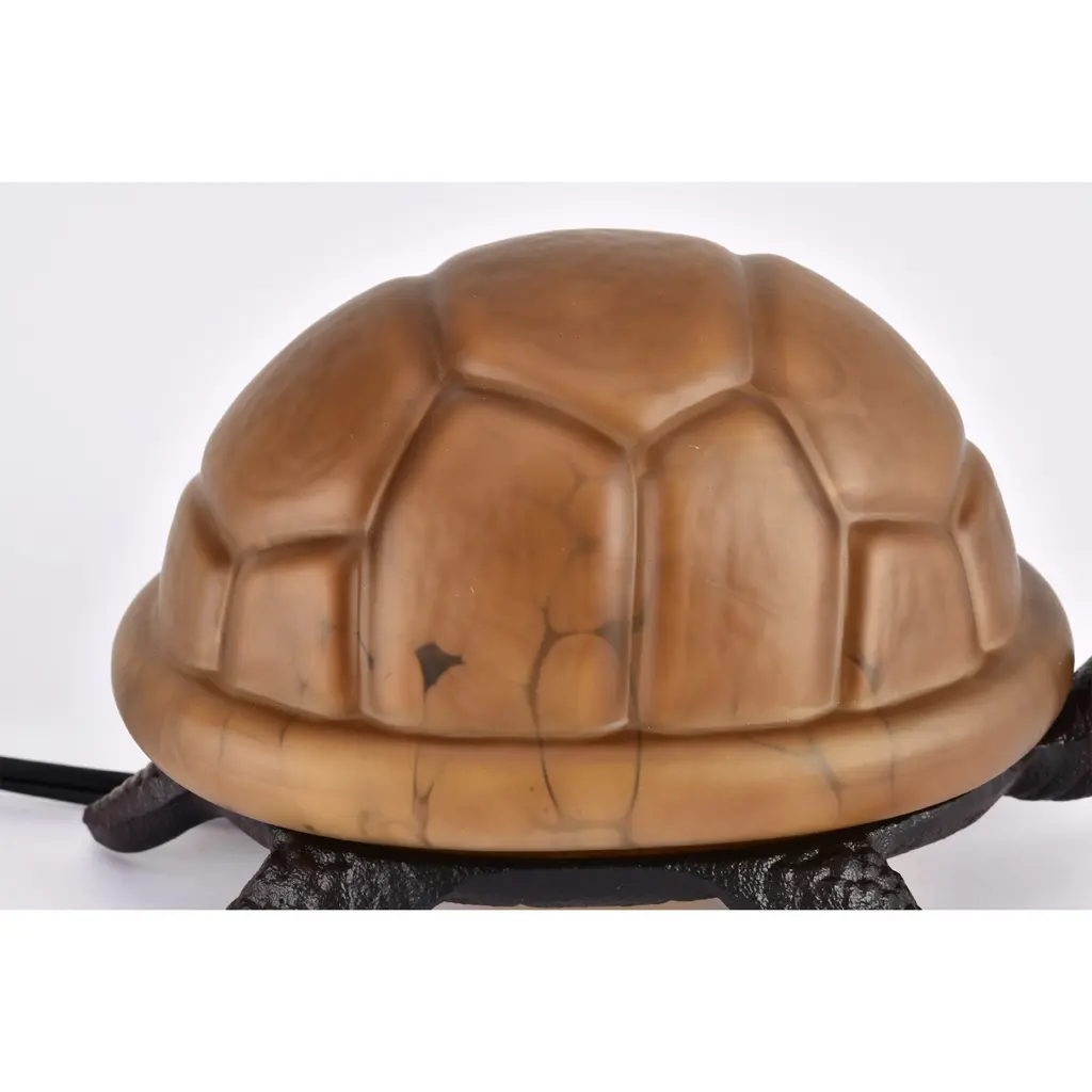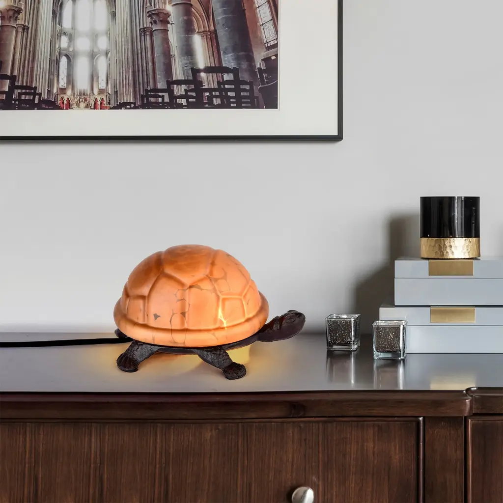 Inject novelty lighting into your decor with this amber turtle accent lamp by Warehouse of Tiffany. This lamp frame fuses metal and glass for sturdiness, and the bronze finish gives an antique-style look. The turtle's amber glass shell filters emitted light, resulting in a soft, warm, golden glow.Lamp cover: AmberIncludes 68 inches of wireSetting: IndoorFixture finish: BronzeShades: Translucent amberOn/off line switchNumber of lights: 1Requires one (1) 40-watt (not included)Dimensions: 4 inches high x 6 inches wide x 8 inches deep