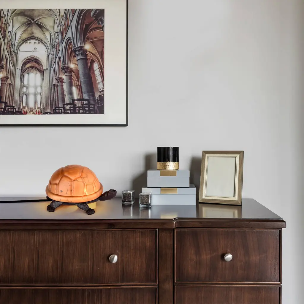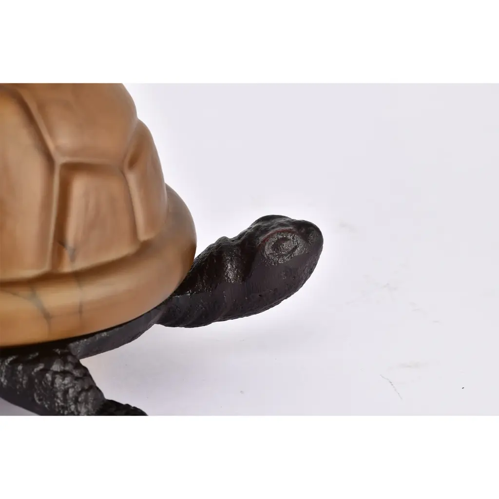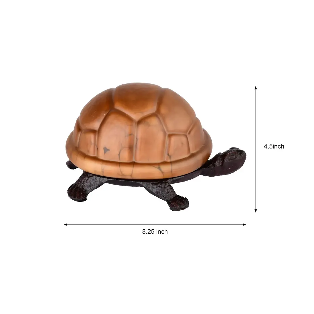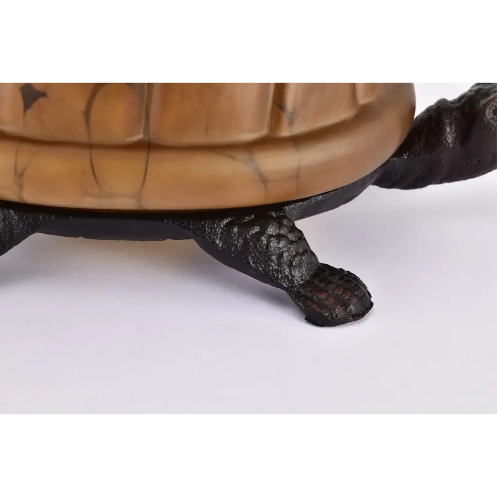 Inject novelty lighting into your decor with this amber turtle accent lamp by Warehouse of Tiffany. This lamp frame fuses metal and glass for sturdiness, and the bronze finish gives an antique-style look. The turtle's amber glass shell filters emitted light, resulting in a soft, warm, golden glow.Lamp cover: AmberIncludes 68 inches of wireSetting: IndoorFixture finish: BronzeShades: Translucent amberOn/off line switchNumber of lights: 1Requires one (1) 40-watt (not included)Dimensions: 4 inches high x 6 inches wide x 8 inches deep