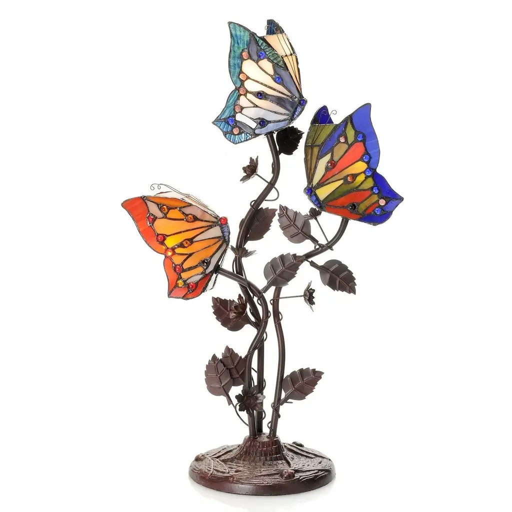 Give a nod to stained glass artistry when incorporating this antique-style Aurelia table lamp from Warehouse of Tiffany into your room design. Three small lights illuminate multi-hued butterfly shapes for a whimsical touch, while the 72-inch power cord allows freedom to place this delicate lamp in a safe spot on a high table.Stained-glass Tiffany-inspired lamp features a beautiful butterfly motifLamp has a 72-inch power cord for ease of plugging inThree-light lampStained-glass butterflies measures 4 inches in diameter x 6 inches in heightLamp is 22 inches highRequires one 25-watt Type B bulb or CFL/LED equivalentStained glass in shades of red, blue, orange, green and yellow