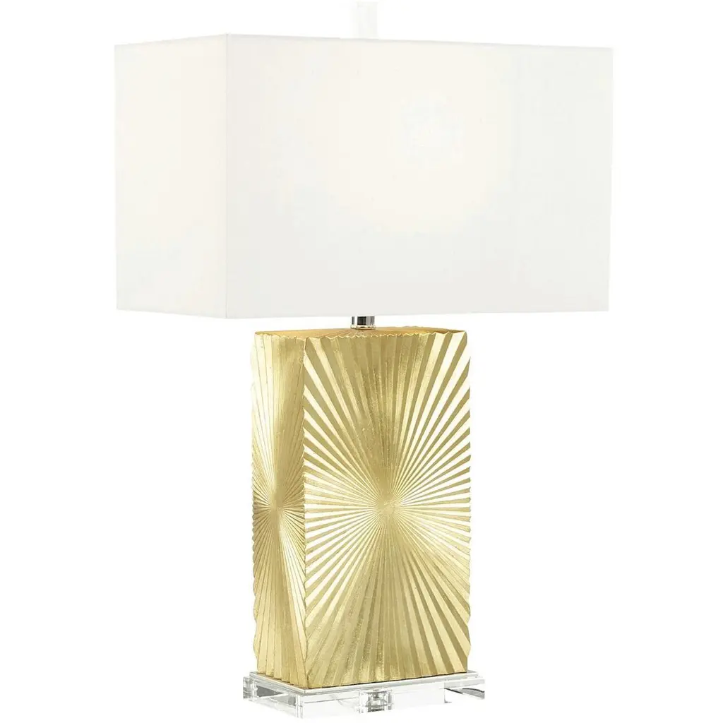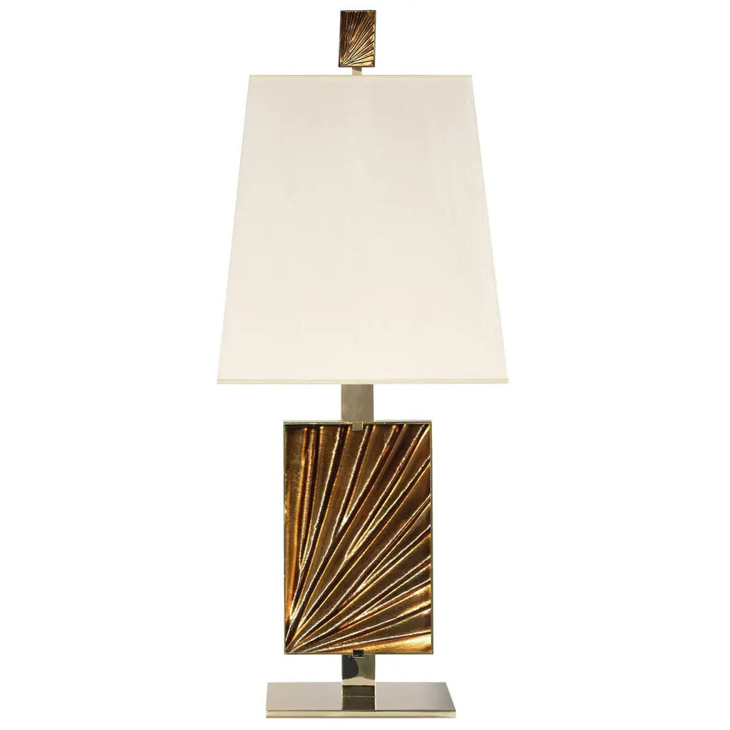This table lamp showcases a rectangular column of molten metal in washed gold.