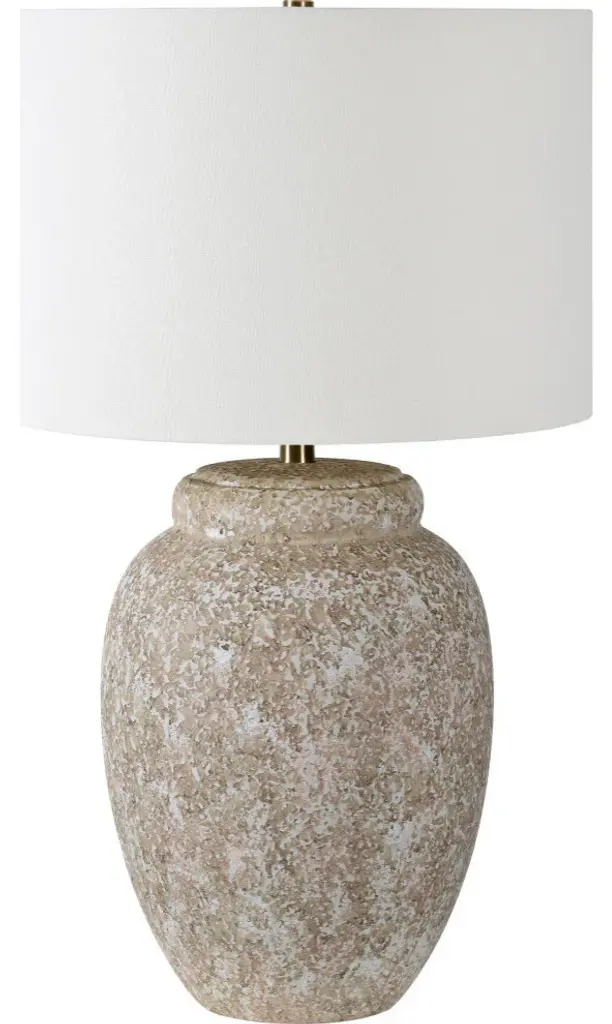 The creativity and inherent charm of this table lamp''s painted ceramic base stands out in the traditional home interior. It is perfectly sized for end table or night stand arrangement. The plated antique brass metal elements and off-white linen drum-shaped shade, bring a crisp quality that is pleasing to the eye on every occasion.