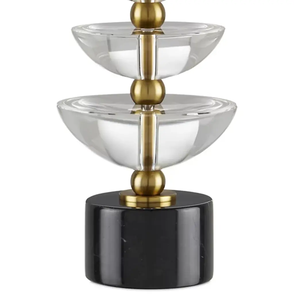 The Waterfall Table Lamp from Currey & Company is an exquisite piece that adds a touch of glamour to your space. Crafted with precision, the lamp features a combination of optic crystal, black marble, and metal, creating a stunning visual impact. The off-white shantung shade complements the cascading bobeches, drawing your eye. With a 3-way socket switch, you have control over the lighting. This table lamp is illuminated by an efficient LED.
