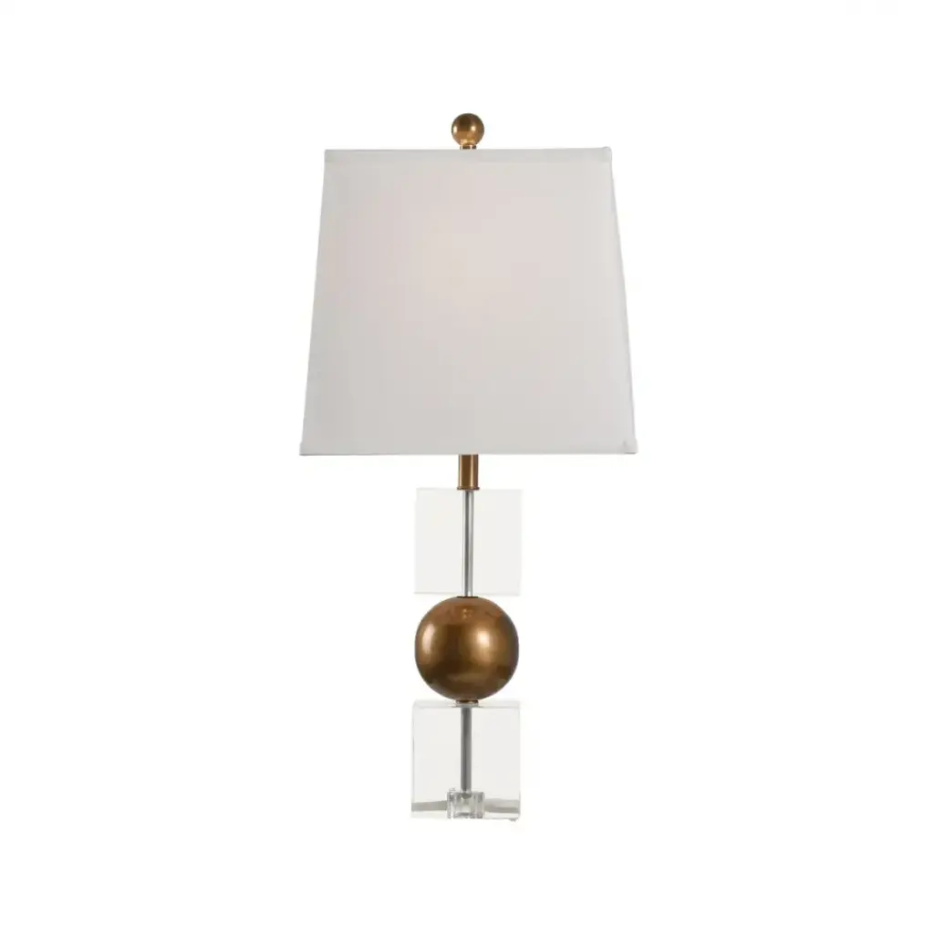The Watts Table Lamp is a distinctive and versatile lighting solution that adds both function and sculptural appeal to your space. It features a unique acrylic block base, offering a clean, contemporary aesthetic, while the antique brass ball elegantly nested between the acrylic blocks adds a touch of warmth and timeless charm. This contrasting combination of materials creates a visually captivating centerpiece that enhances any décor. Topped with a crisp round white fabric shade