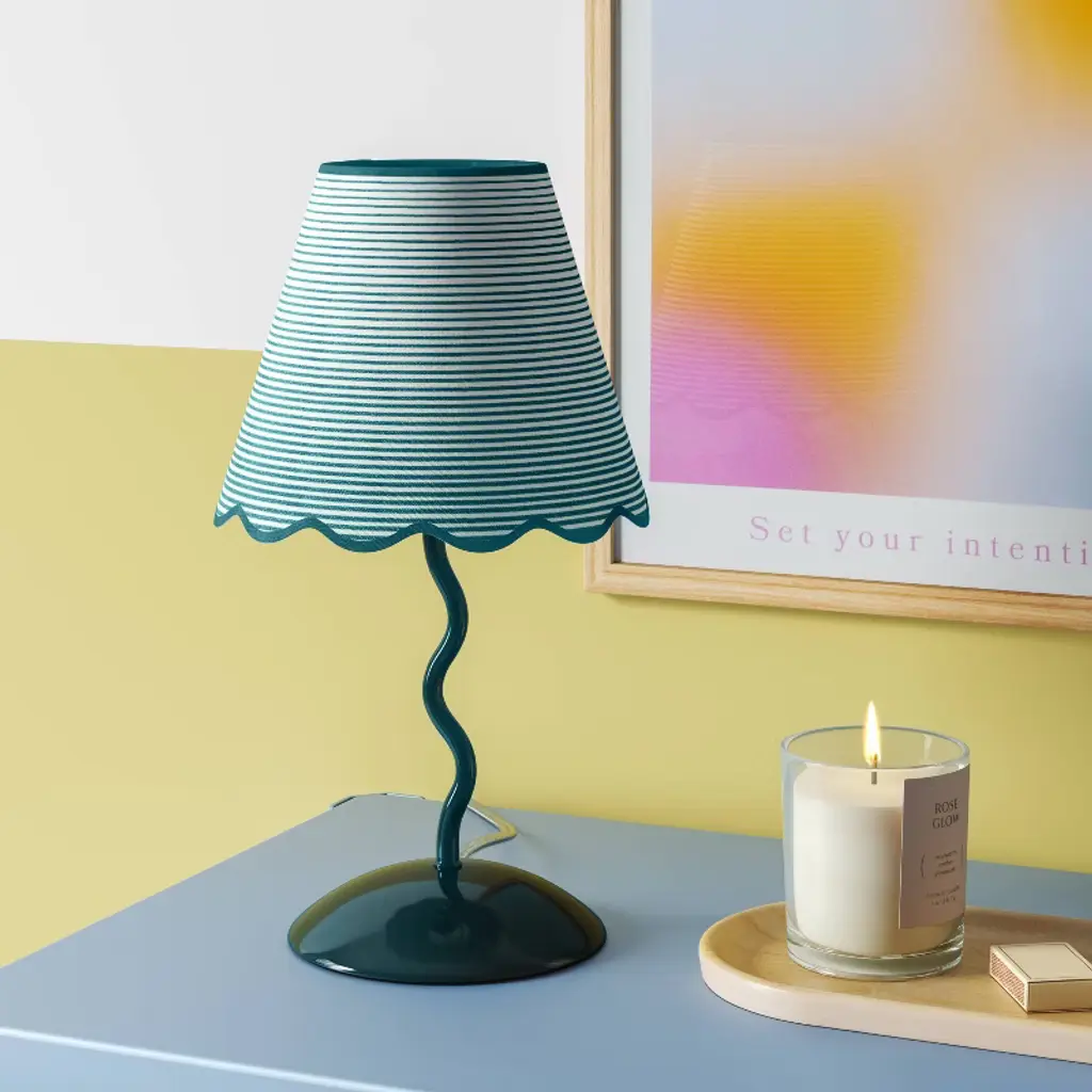 Add a gorgeous glow to any space with the Wave Squiggle Table Lamp from Room Essentials™. The decorative table lamp has a white fabric shade with green scalloped edges and striped pattern paired with a wave squiggle body to add depth and texture to your home decor. The fabric shade exudes a soft, warm glow when turned on and the electric power source allows for easy function. Place it on your entryway table, console or sideboard for stylish lighting.Room Essentials™: Everyday Value