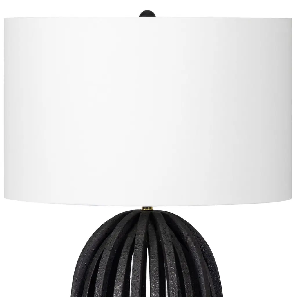 The Webbed Table Lamp is made of sculpted metal with a blackened iron finish, perfectly merging artistic form and function. Paired with a crisp, linen shade and natural brass fittings, the Webbed Table Lamp would sit beautifully in a modern living room, bedside or on an entry console.