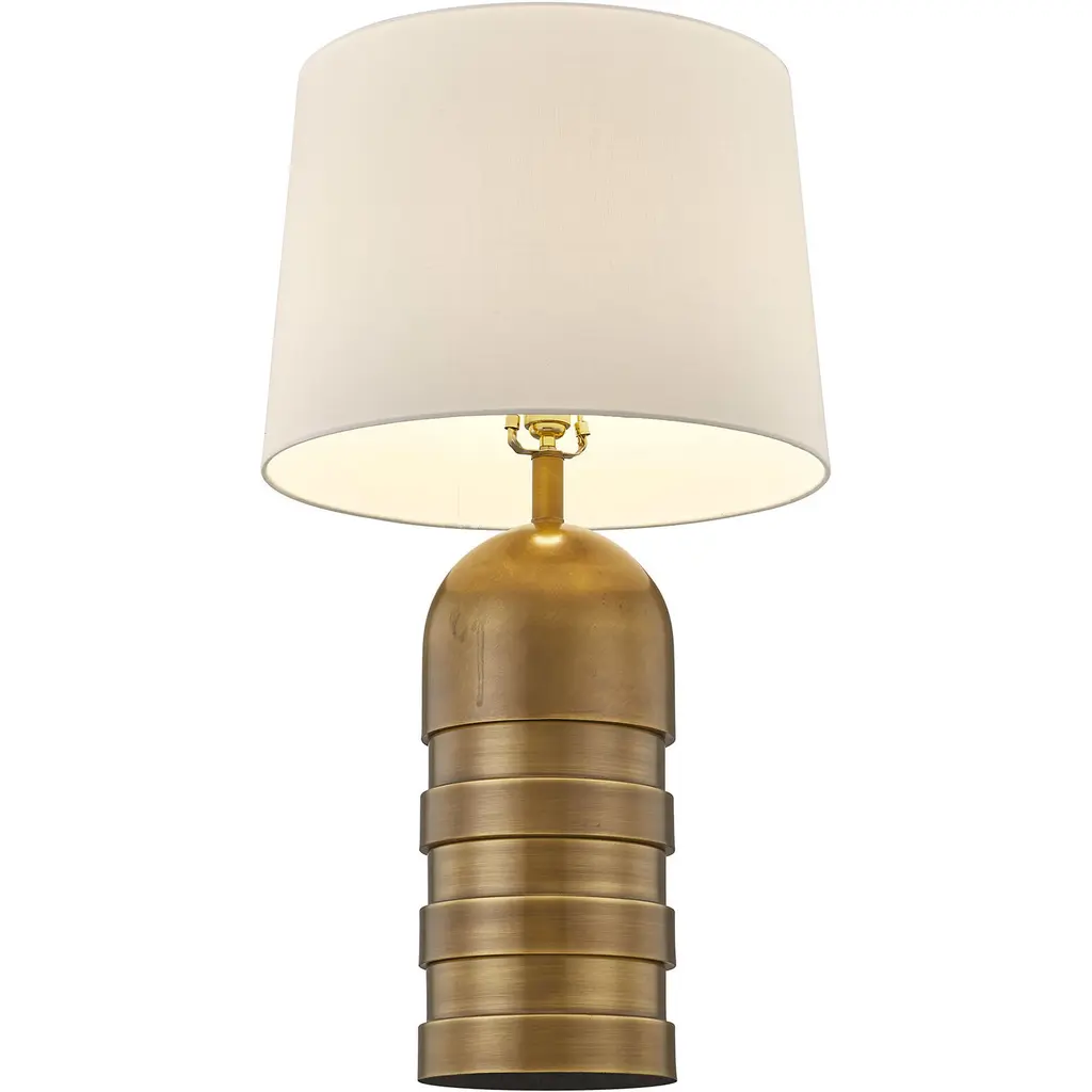 Make a bold style statement with this stunning Coco & Dash Wehunt table lamp, which showcases an almost bullet-like structure that is adorned in plated brass and topped off with a white fabric shade. This lamp is 32" in height and 18" in width. It uses one standard size bulb of up to 100 watts. Bulb not included.
