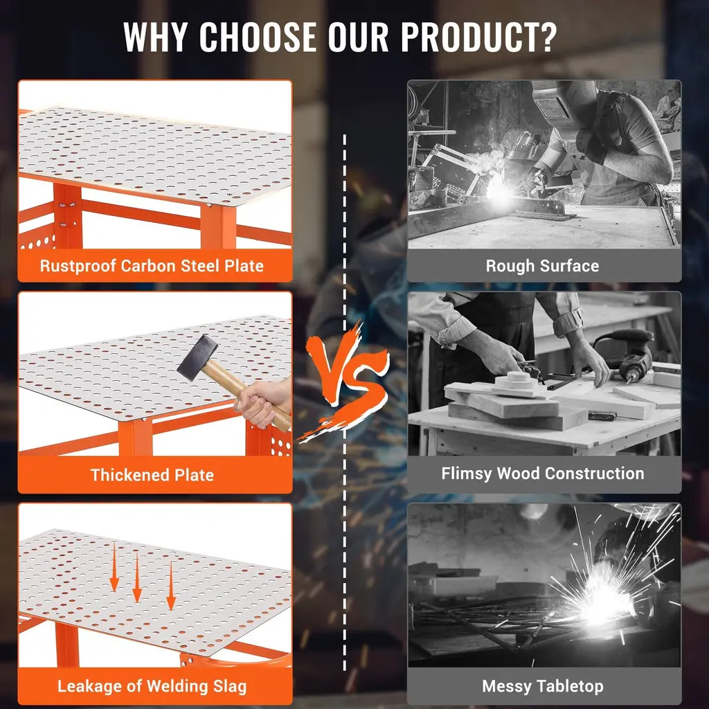【Achieve Perfect Welding】Whether you are a metal enthusiast or an experienced professional, the welding table offers a wide range of applications. It has a spacious 36-inch x 24-inch desktop area to meet a variety of work needs, facilitating easy welding of complex and small parts. 【Unparalleled Stability and Safety】This welding workbench is made of a sturdy and lightweight carbon steel frame with a load-bearing capacity of up to 600 pounds. Its advanced carbon steel plate surface is carefully treated with excellent wear and rust resistance, ensuring unparalleled durability and life. 【Easily Weld】216 5/8-inch clamp holes make it easy for this welding table to clamp your clamps, while the innovative double-layer storage plate design doubles your storage capacity. Use the convenient side tool hanging plate and 11 hooks to keep your tools at your fingertips. 【Easy to Move】The addition of wheels and cups makes it more convenient to move, while the sturdy structure provides a sense of security. The wide and comfortable handle makes it easy to move and can be easily moved to any desired location. 【Easy Assembly】The assembly of the welding table is very simple, and you can easily follow the instructions to complete the installation. The upgraded packaging design can better protect the product, ensuring that the product is delivered to your doorstep intact.