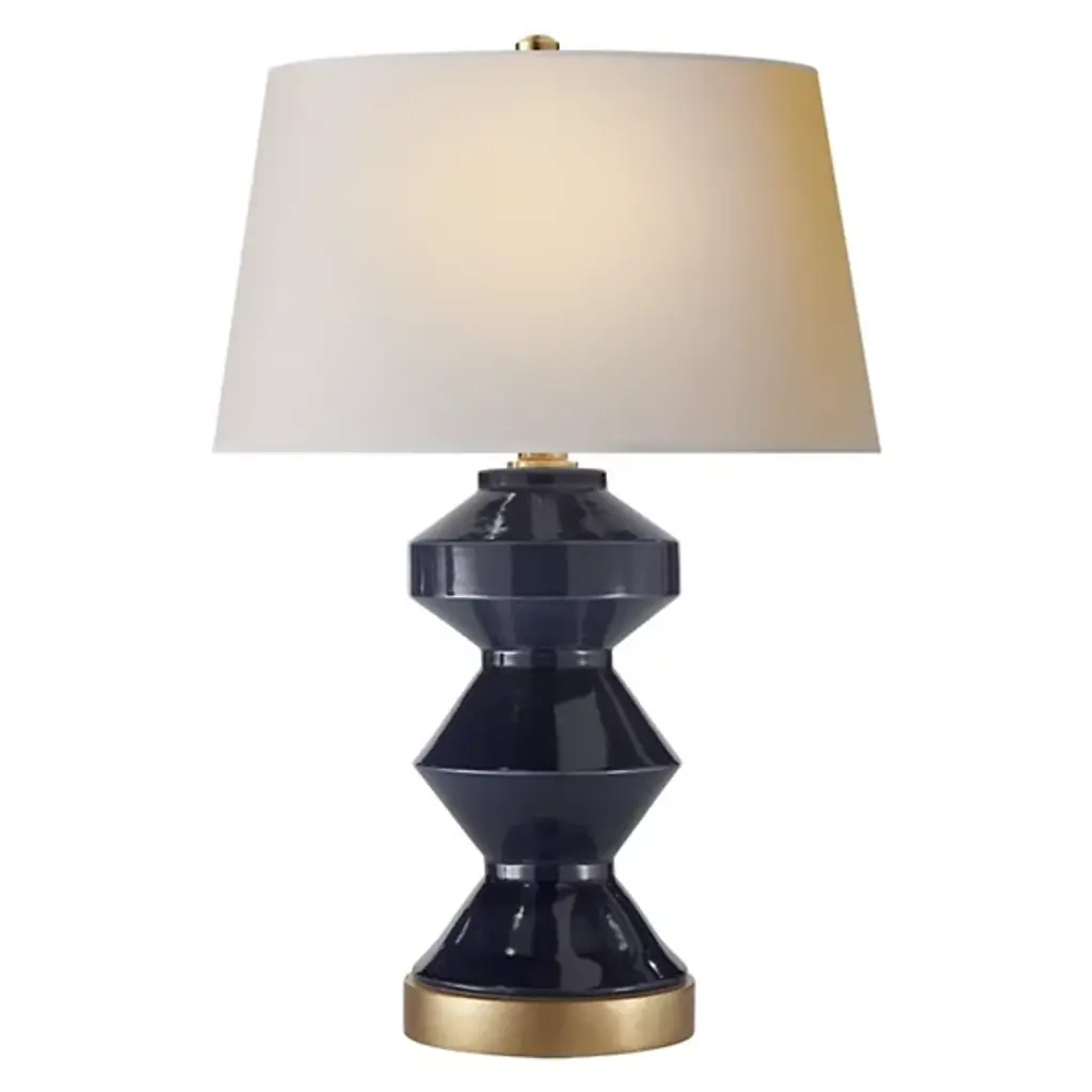 Bring a modish modern presence to side tables and interiors with the Weller Zig-Zag Table Lamp from Visual Comfort Signature, formerly known as Visual Comfort, Steadied atop a sleek disc base, it extends an array of simple geometric shapes upward to place a single socket lamp beneath a flared shade of natural paper. The shade’s translucent texture obscures direct brightness to the sides, scattering a wash of reflected radiance across the smooth ceramic surface of the angular body below.
