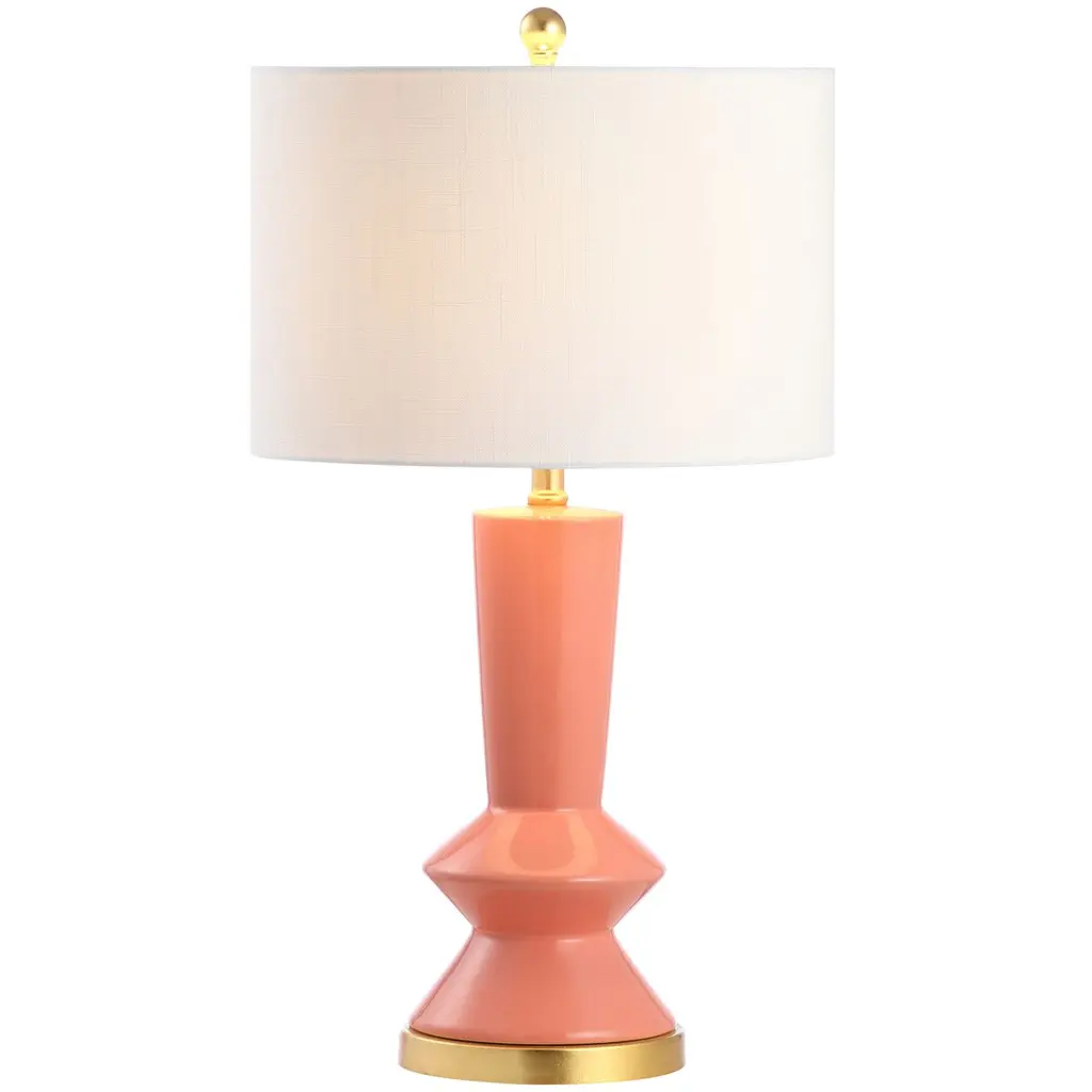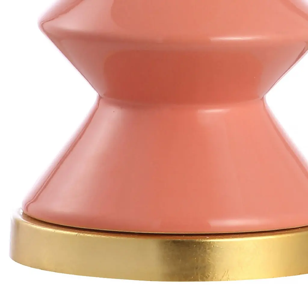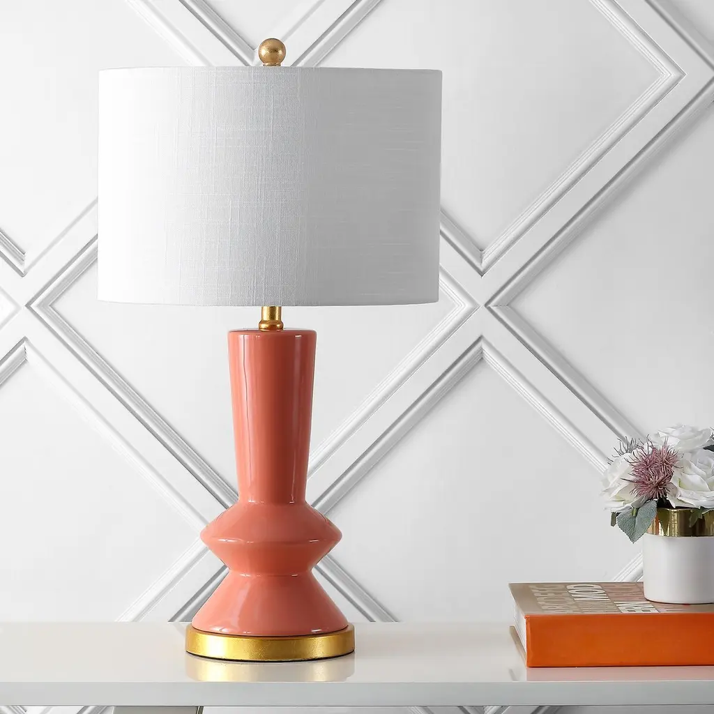 This table lamp's angular ceramic body pays homage to Mid-Century Modern chic; the glossy finish and the golden base and finial add contemporary glamour. The linen shade and the silk-wrapped cord are refined grace notes.