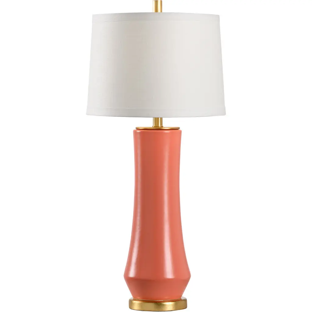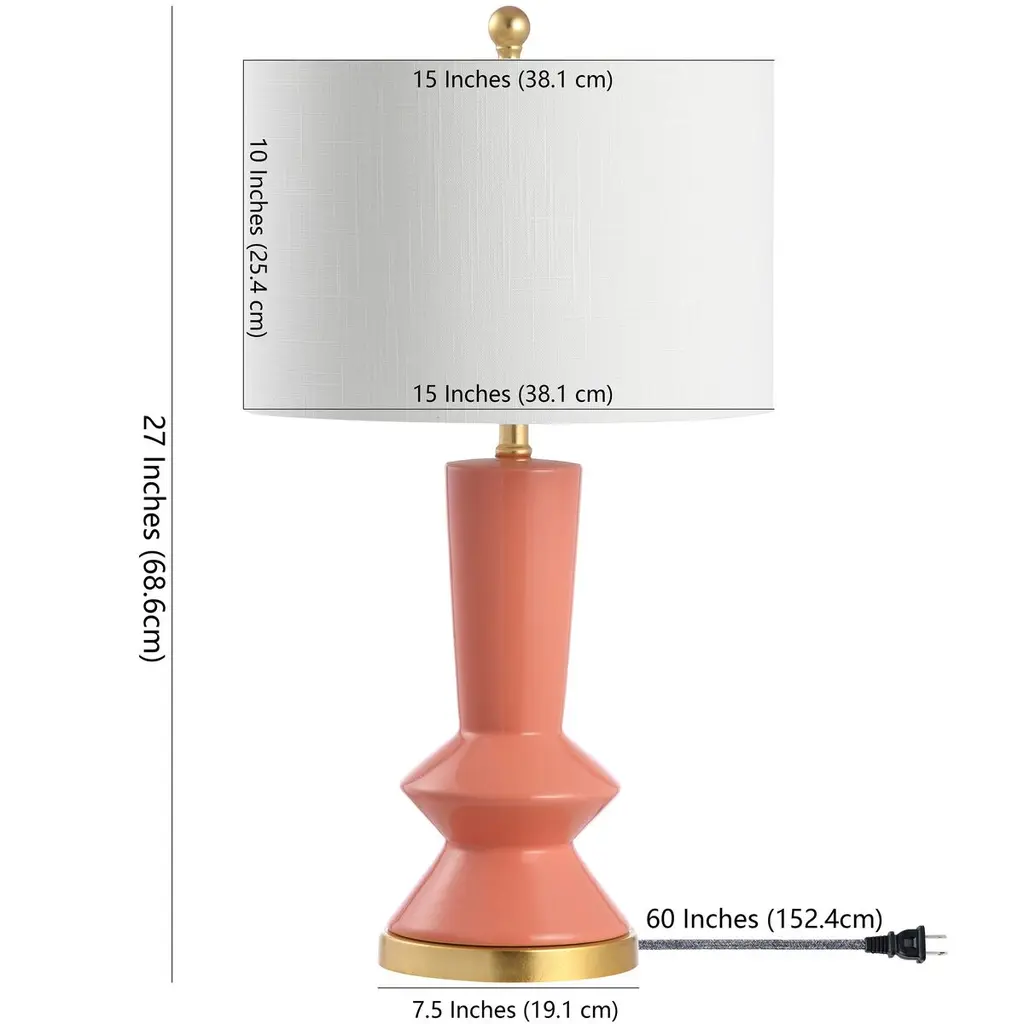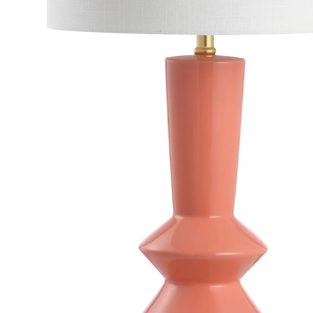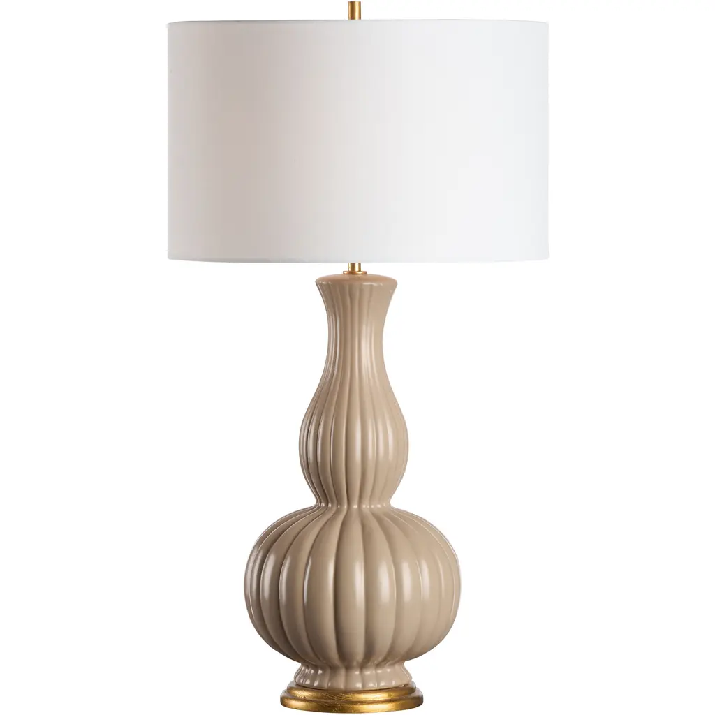 This table lamp's angular ceramic body pays homage to Mid-Century Modern chic; the glossy finish and the golden base and finial add contemporary glamour. The linen shade and the silk-wrapped cord are refined grace notes.