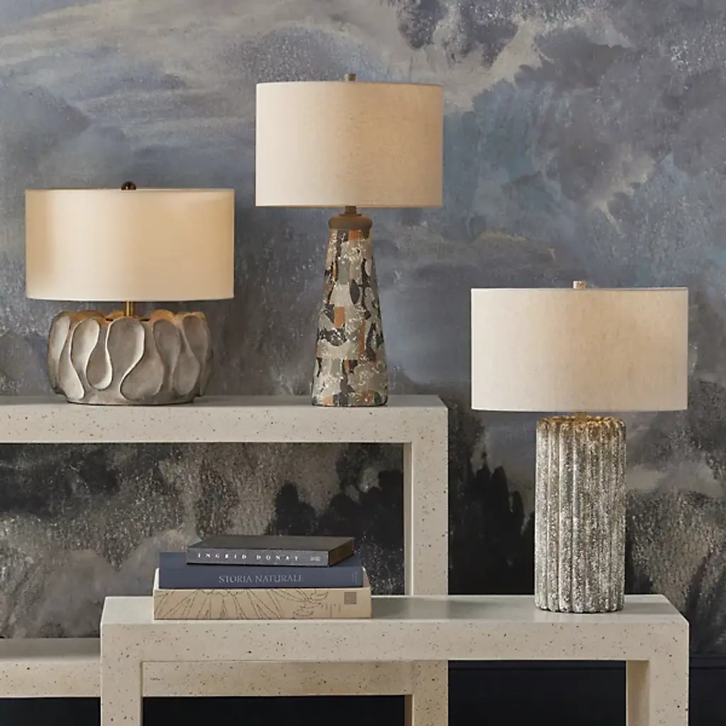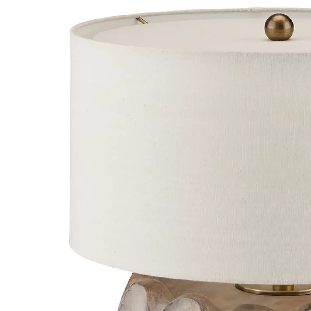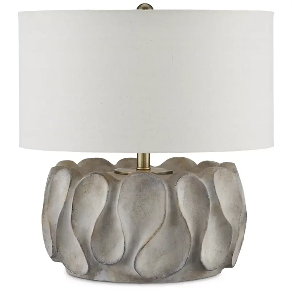 The Weststrand Table Lamp from Currey & Company brings soothing sculptural character to any space with its flowing shape and spoon-shaped swells pressed into cast concrete. These unique, subtly distinct impressions create an artistic statement, enhancing the rugged gray lamp's texture. The light antique brass finish on the hardware emphasizes similar tones in the cement, while a beige linen shade caps off this transitional lamp, matching textured, artistic flair with practical design elements.