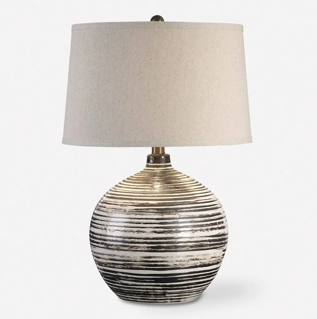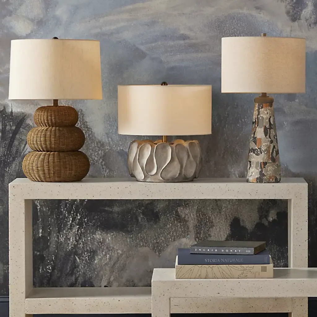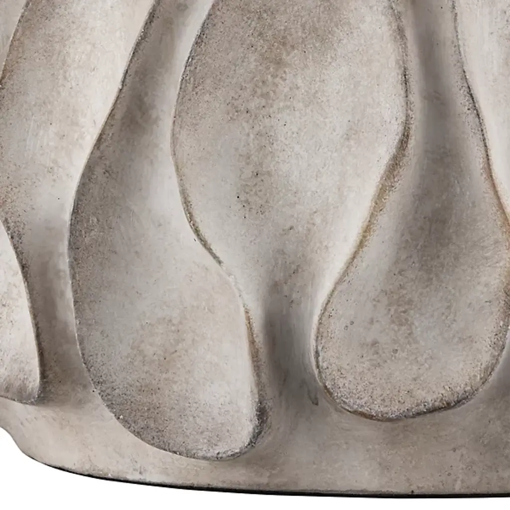 The Weststrand Table Lamp from Currey & Company brings soothing sculptural character to any space with its flowing shape and spoon-shaped swells pressed into cast concrete. These unique, subtly distinct impressions create an artistic statement, enhancing the rugged gray lamp's texture. The light antique brass finish on the hardware emphasizes similar tones in the cement, while a beige linen shade caps off this transitional lamp, matching textured, artistic flair with practical design elements.