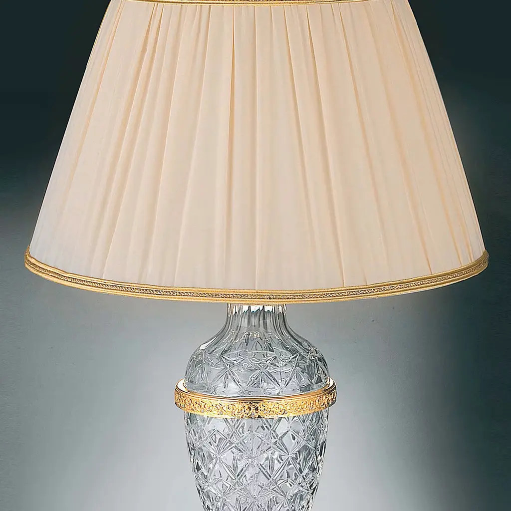 This elegant lamp can sit on top of your dresser adding a touch of luxury to your home. The clear crystal body of the piece is beautiful accented by a belt in gold color wrapped around its center, and a gold colored base. The white lampshade is accented with gold colored piping around both its top and bottom edges.