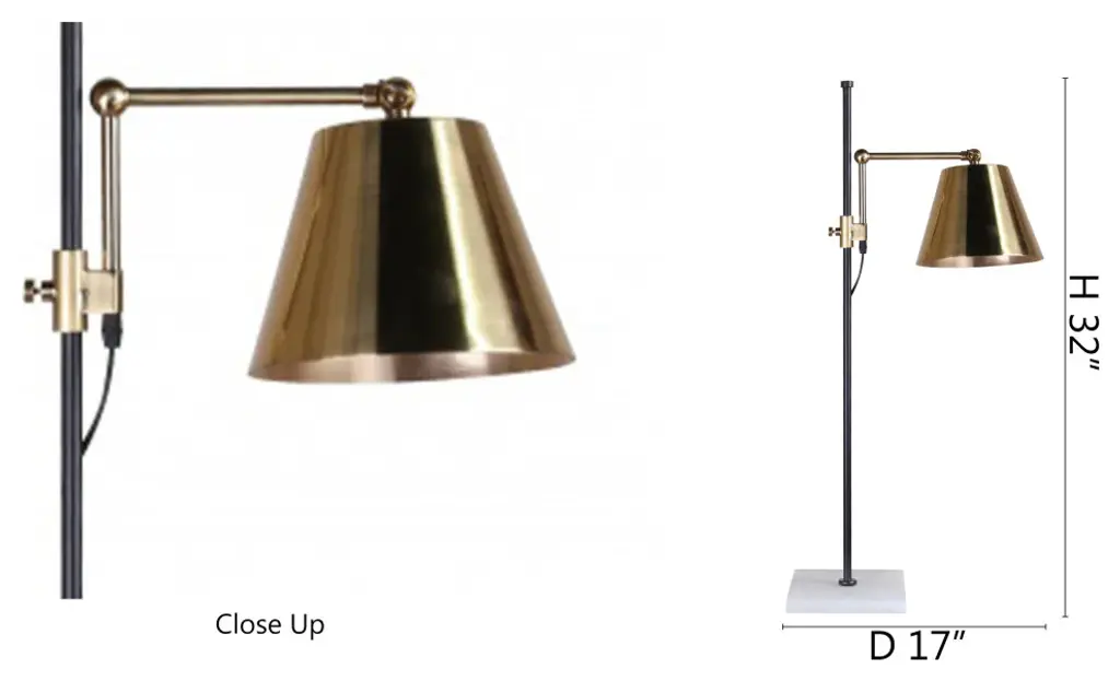 This table lamp contains a white marble base, black metal rod as a frame, and a brass metal shade. It is great for chair side reading or general room illumination.Lighting Information:Bulb type: E26Max wattage: 100Number of bulbs: 1Bulb not included