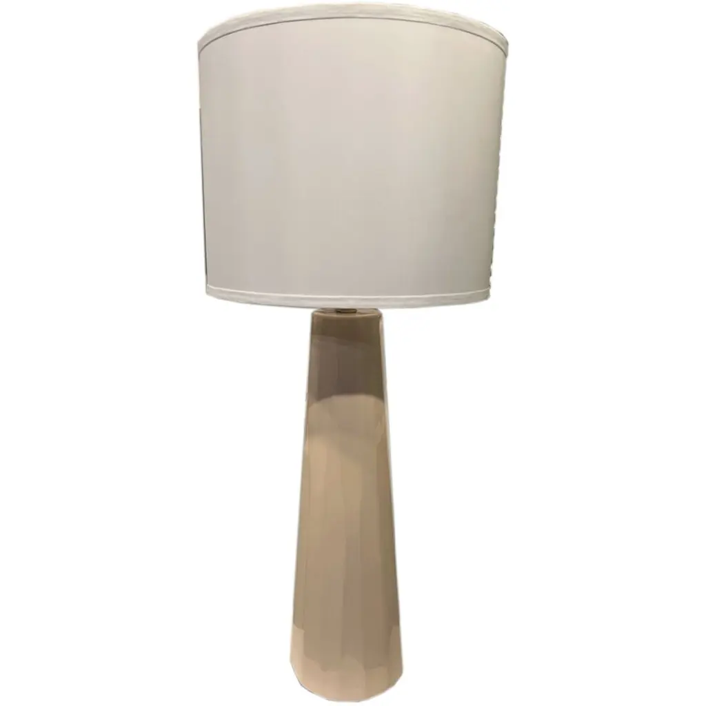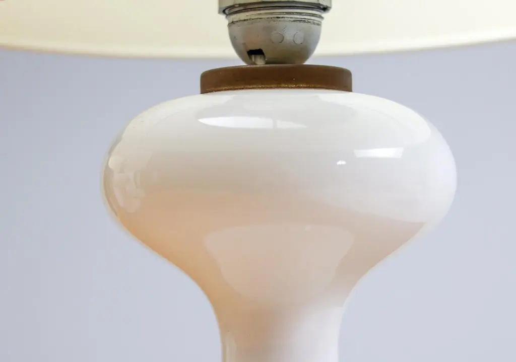 Great white hand-blown glass table lamps with a white linen shade designed in 1968 by Ingo Maurer for his company M-Design. Very elegant design that gives a warm atmosphere to a room despite the strict modern appearance. The light switch was designed by Achile Castiglioni.We have 2 lamps, priced individually.Unique opportunity to purchase a matching pair of this early and desirable design by Ingo Maurer.